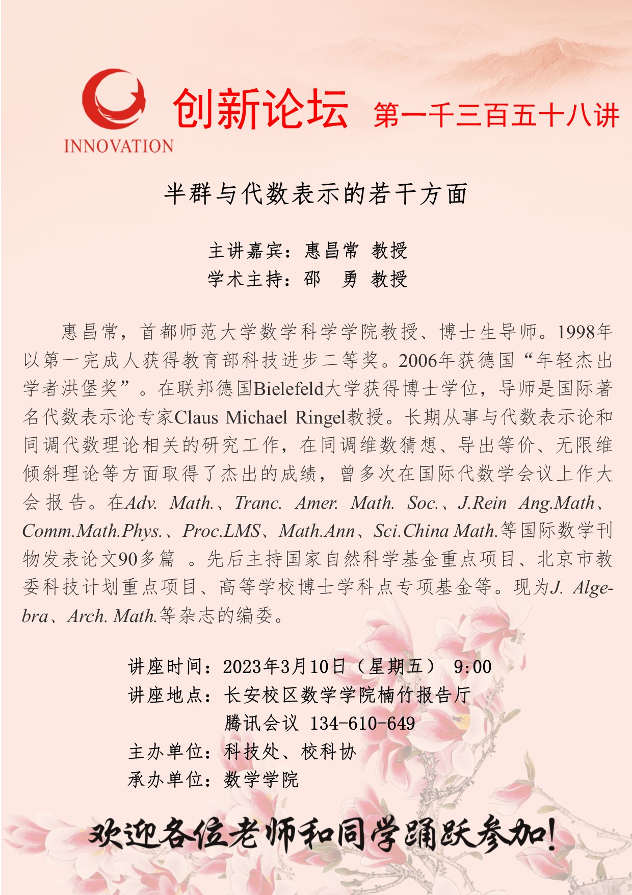 惠昌常 教授 必赢3003no1线路检测中心创新论坛第一千三百五十八讲:半群与代数表示的若干方面 讲座时间 2023年3月10日(星期五) 9:00 讲座地点 长安校区数学学院楠竹报告厅、腾讯会议134-610-649 讲座人介绍 惠昌常 教授 讲座内容