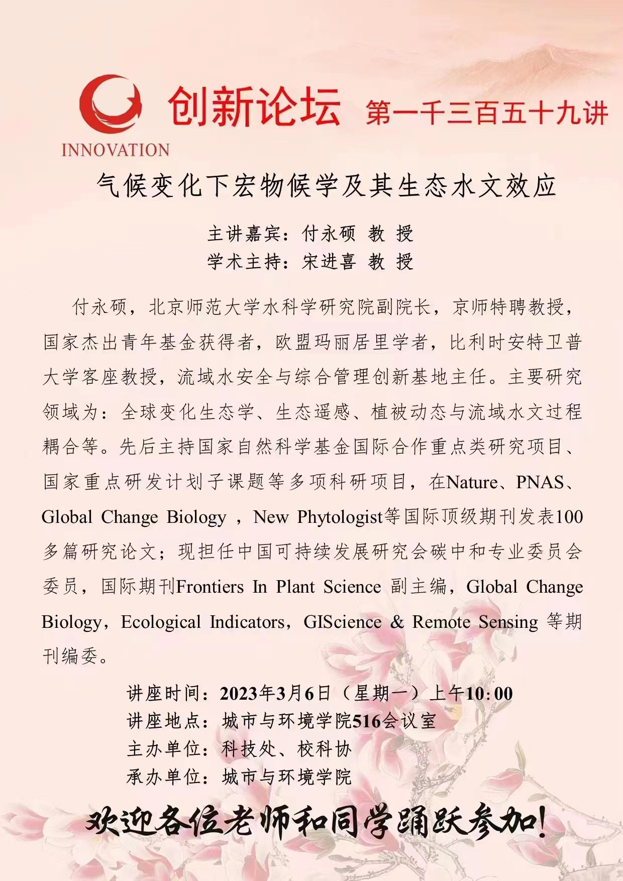 必赢3003no1线路检测中心创新论坛第一千三百五十九讲:气候变化下宏物候学及生态水文效应 讲座时间 2023年3月6日(星期一)上午10:00 讲座地点 城市与环境学院516会议室 讲座人介绍 讲座内容
