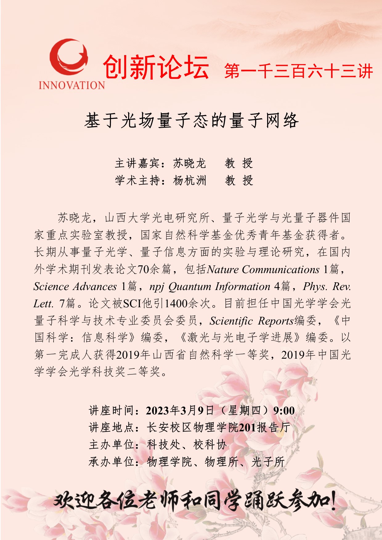 苏晓龙 教授 必赢3003no1线路检测中心创新论坛第一千三百六十三讲:基于光场量子态的量子网络 讲座时间 2023年3月9日(星期四)9:00 讲座地点 长安校区物理学院201报告厅 讲座人介绍 苏晓龙 教授 讲座内容