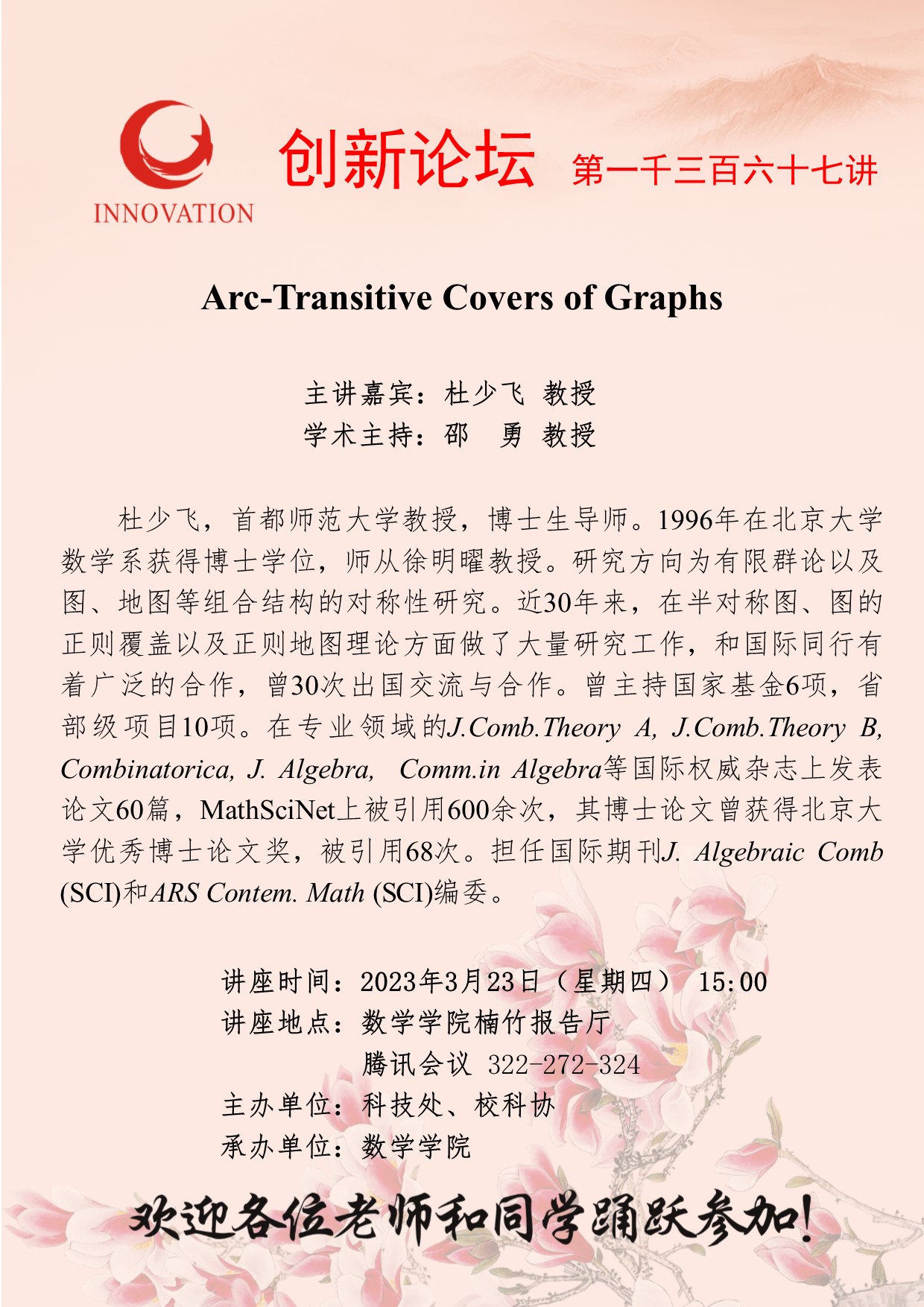 杜少飞 教授 必赢3003no1线路检测中心创新论坛第一千三百六十七讲:Arc-Transitive Covers of Graphs 讲座时间 2023年3月23日(星期四) 15:00 讲座地点 数学学院楠竹报告厅、腾讯会议 322-272-324 讲座人介绍 杜少飞 教授 讲座内容