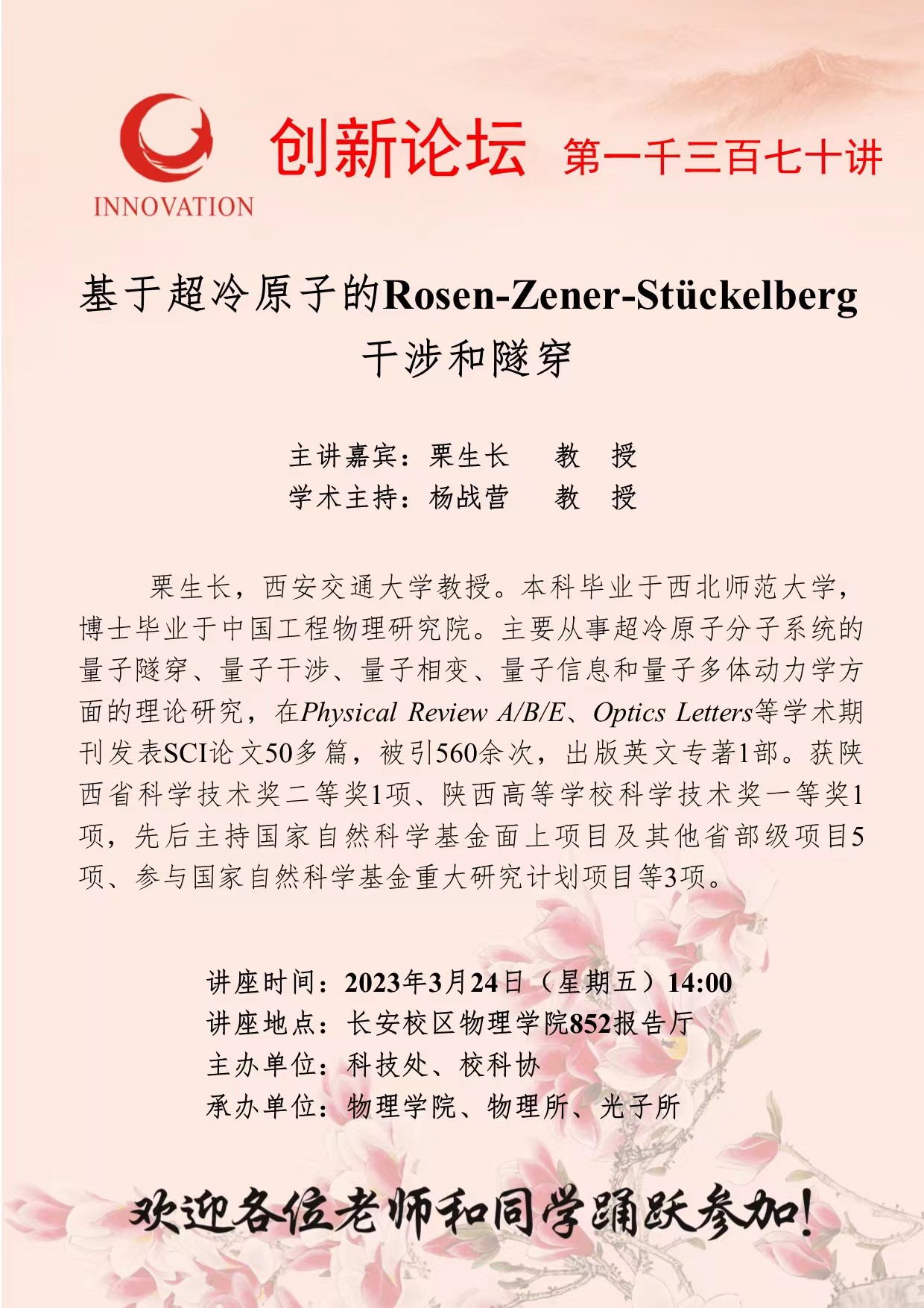 栗生长 教 授 必赢3003no1线路检测中心创新论坛第一千三百七十讲:基于超冷原子的Rosen-Zener-Stückelberg干涉和隧穿 讲座时间 2023年3月24日(星期五)14:00 讲座地点 长安校区物理学院852报告厅 讲座人介绍 栗生长 教 授 讲座内容