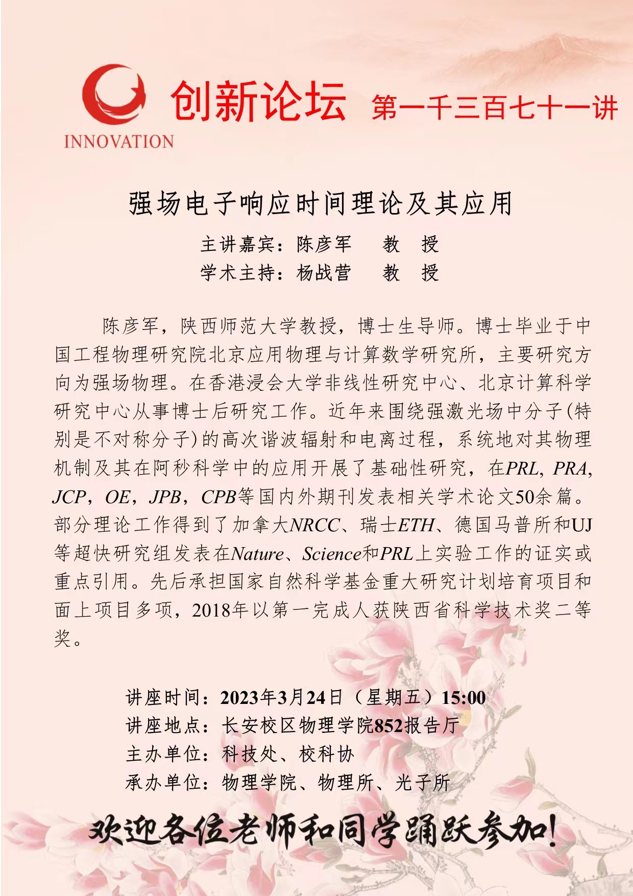 陈彦军 教 授 必赢3003no1线路检测中心创新论坛第一千三百七十一讲:强场电子响应时间理论及其应用 讲座时间 2023年3月24日(星期五)15:00 讲座地点 长安校区物理学院852报告厅 讲座人介绍 陈彦军 教 授 讲座内容