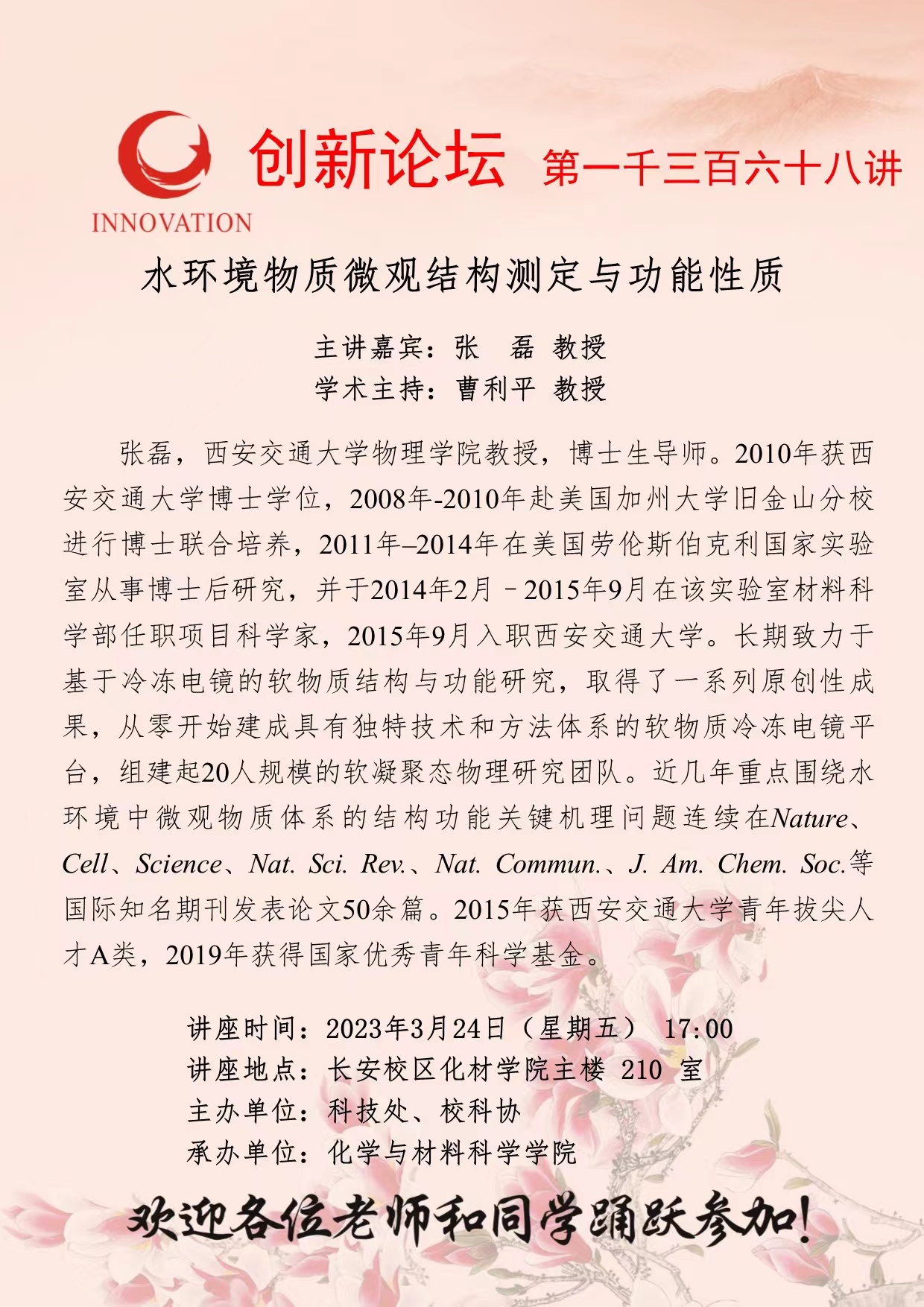 张磊 教授 必赢3003no1线路检测中心创新论坛第一千三百六十八讲:水环境物质微观结构测定与功能性质机理 讲座时间 2023年3月24日(星期五) 17:00 讲座地点 长安校区化材学院主楼 210 室 讲座人介绍 张磊 教授 讲座内容