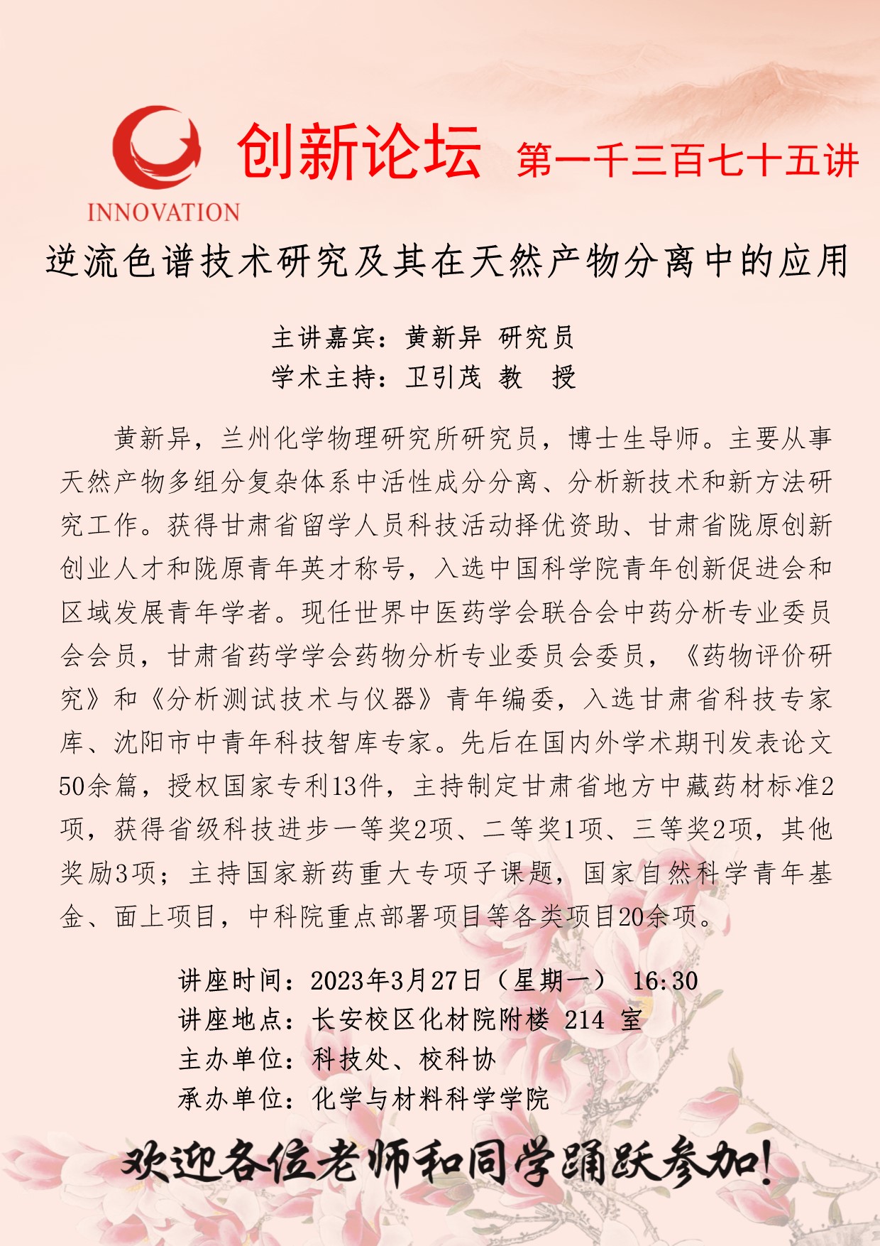 黄新异 研究员 必赢3003no1线路检测中心创新论坛第一千三百七十五讲:逆流色谱技术研究及其在天然产物分离中的应用 讲座时间 2023年3月27日(星期一) 16:30 讲座地点 长安校区化材院附楼214室 讲座人介绍 黄新异 研究员 讲座内容