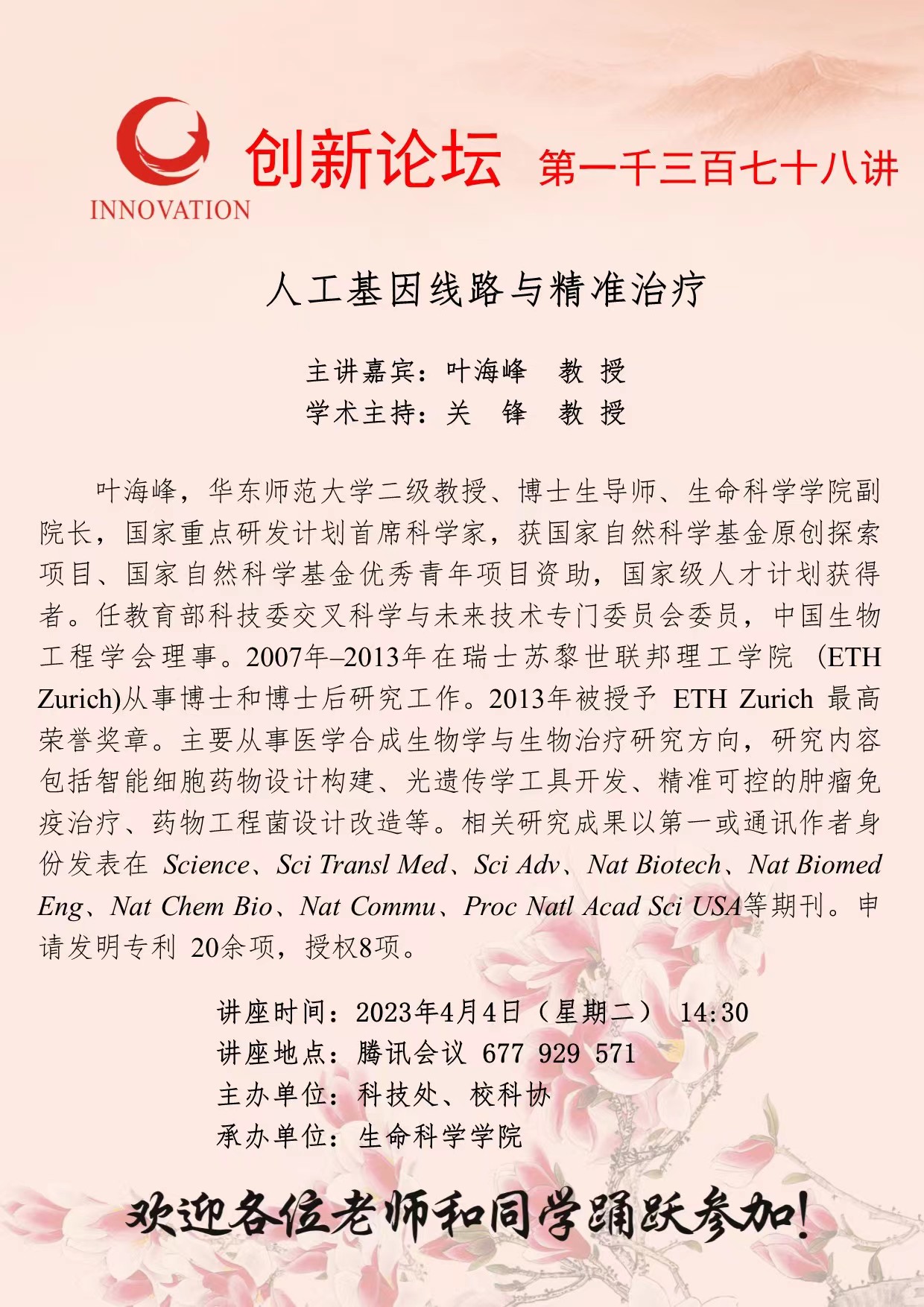 叶海峰 教授 必赢3003no1线路检测中心创新论坛第一千三百七十八讲:人工基因线路与精准治疗 讲座时间 2023年4月4日(星期二) 14:30 讲座地点 腾讯会议 677 929 571 讲座人介绍 叶海峰 教授 讲座内容