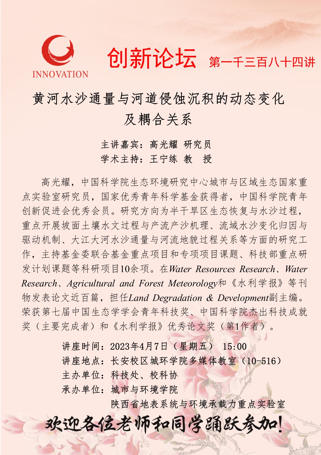 高光耀 研究员 必赢3003no1线路检测中心创新论坛第一千三百八十四讲:黄河水沙通量与河道侵蚀沉积的动态变化及耦合关系 讲座时间 2023年4月7日(星期五) 15:00 讲座地点 长安校区城环学院多媒体教室(10-516) 讲座人介绍 高光耀 研究员 讲座内容