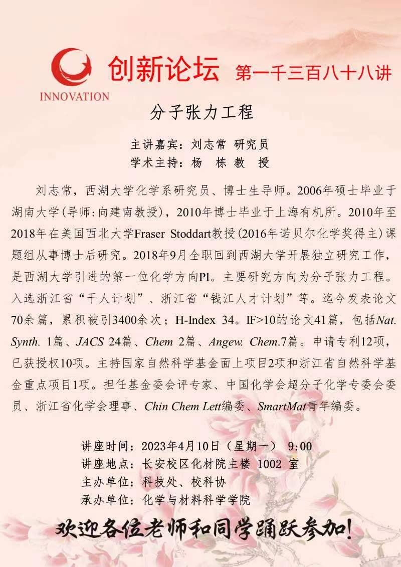 刘志常 研究员 必赢3003no1线路检测中心创新论坛第一千三百八十八讲:分子张力工程 讲座时间 2023年4月10日(星期一) 9:00 讲座地点 长安校区化材院主楼1002 讲座人介绍 刘志常 研究员 讲座内容