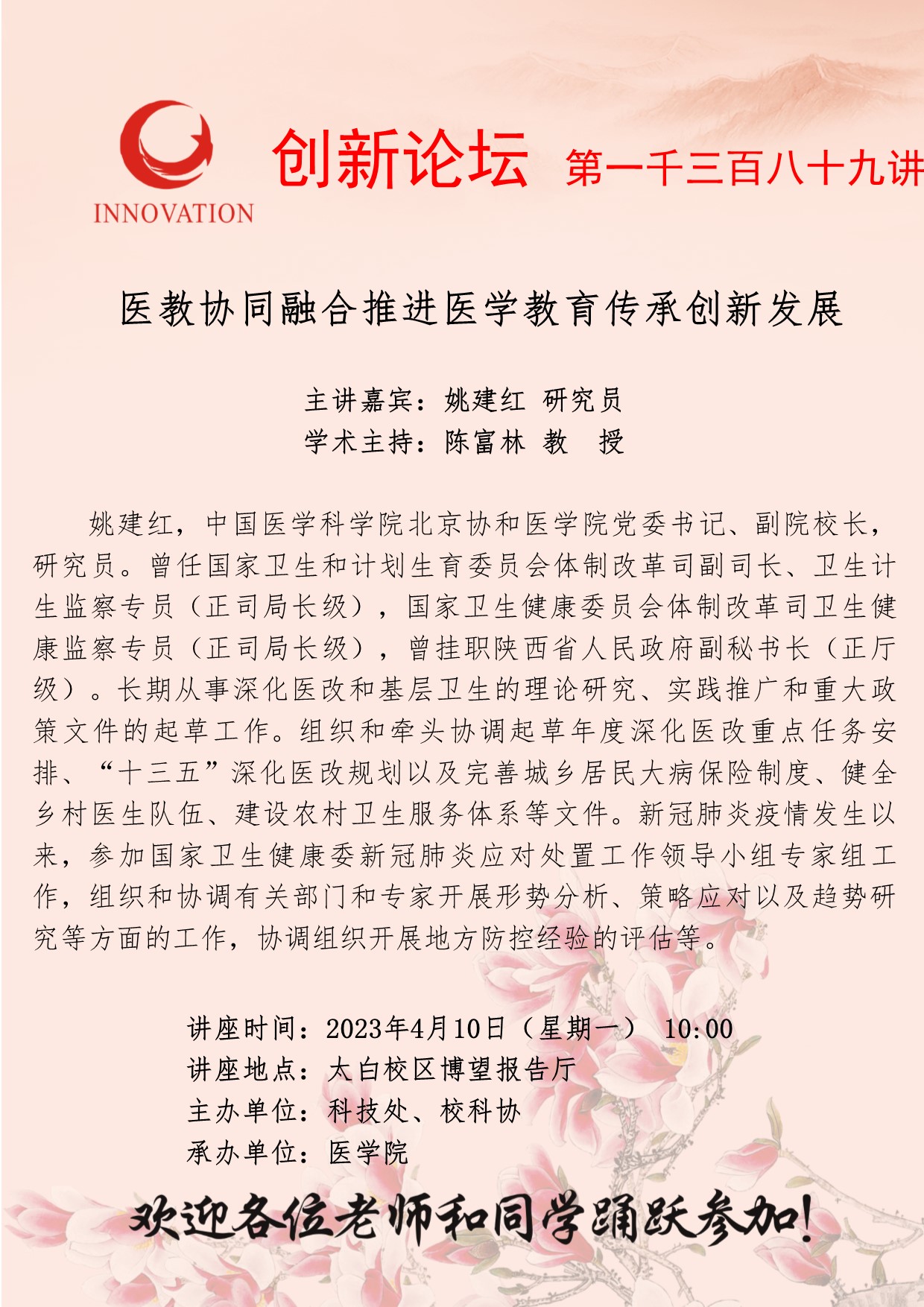 姚建红 研究员 必赢3003no1线路检测中心创新论坛第一千三百八十九讲:医教协同融合推进医学教育传承创新发展 讲座时间 2023年4月10日(星期一) 10:00 讲座地点 太白校区博望报告厅 讲座人介绍 姚建红 研究员 讲座内容