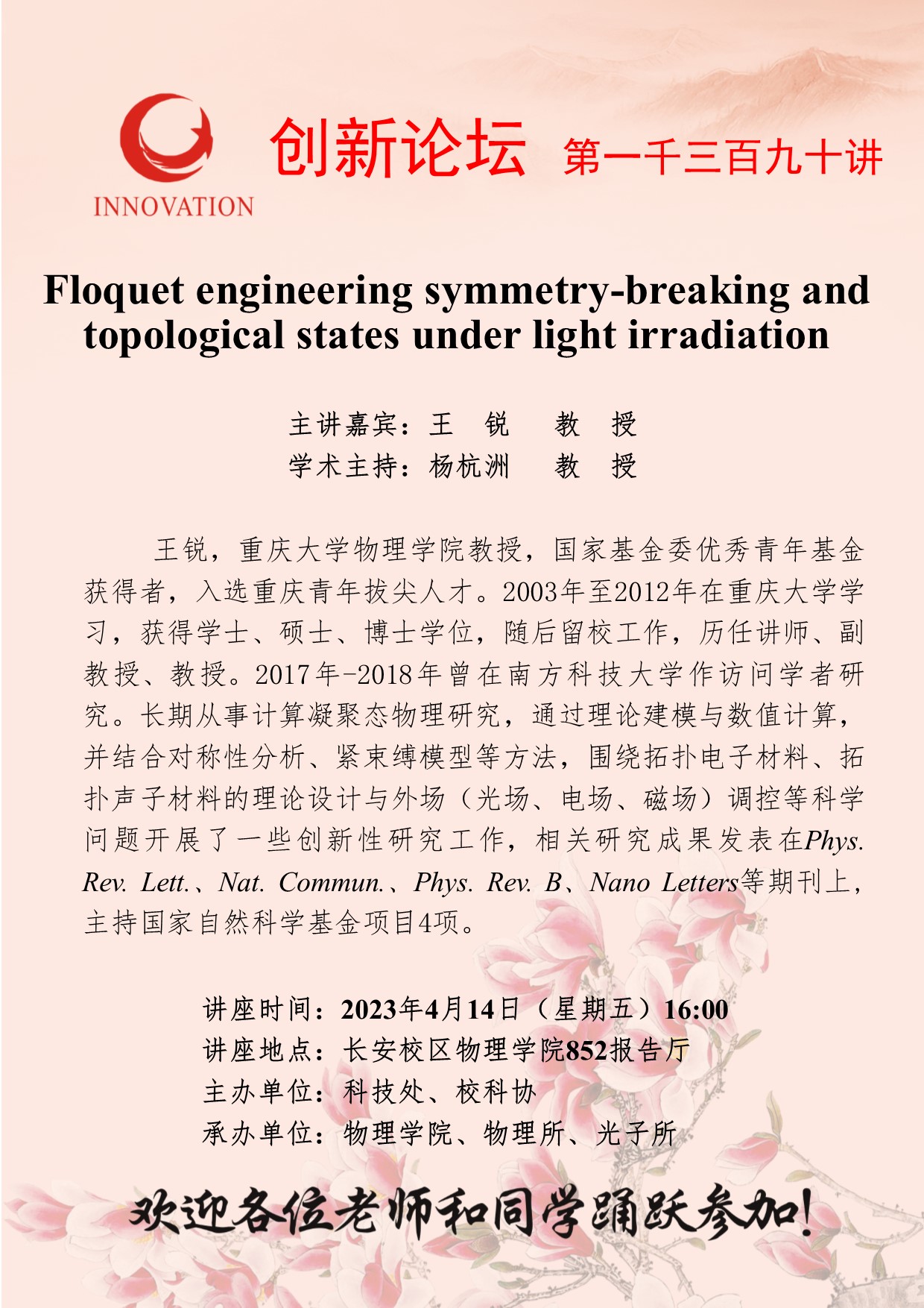 王锐 教授 必赢3003no1线路检测中心创新论坛第一千三百九十讲:Floquet engineering symmetry-breaking and topological states under light irradiation 讲座时间 2023年4月14日(星期五)16:00 讲座地点 长安校区物理学院852报告厅 讲座人介绍 王锐 教授 讲座内容