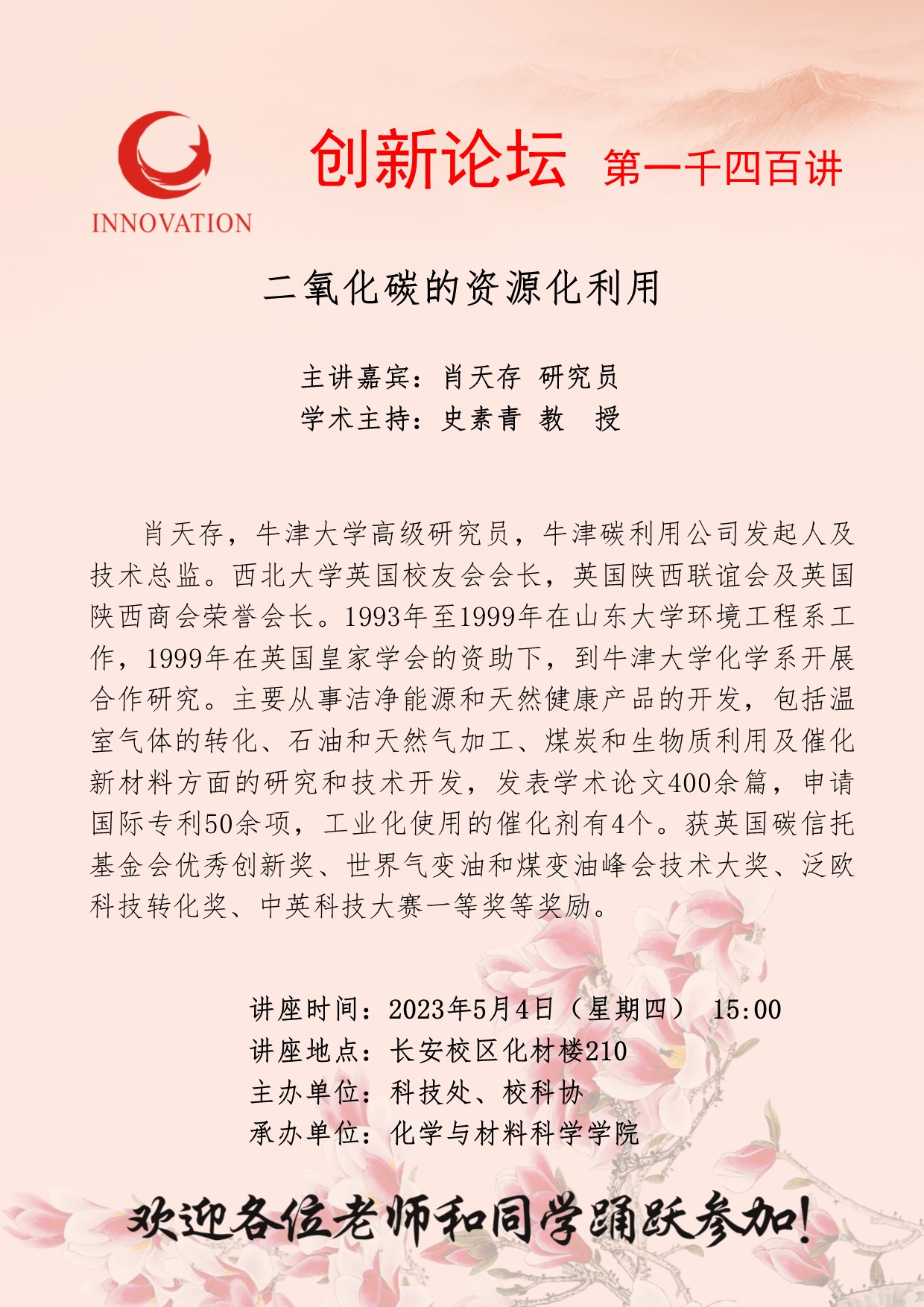 肖天存 研究员 必赢3003no1线路检测中心创新论坛第一千四百讲:二氧化碳的资源化利用 讲座时间 2023年5月4日(星期四) 15:00 讲座地点 长安校区化材楼210 讲座人介绍 肖天存 研究员 讲座内容
