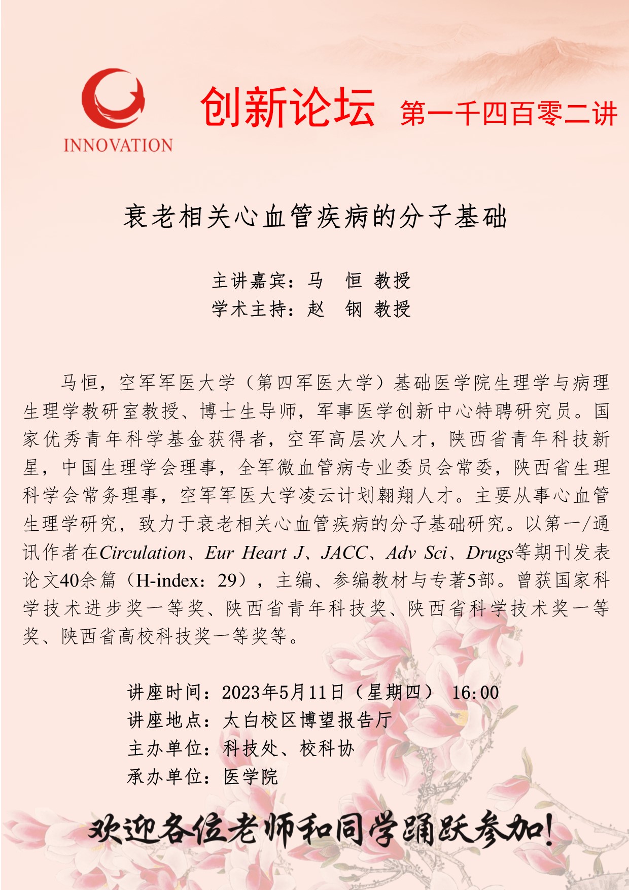 马恒 教授 必赢3003no1线路检测中心创新论坛第一千四百零二讲:衰老相关心血管疾病的分子基础 讲座时间 2023年5月11日(星期四) 16:00 讲座地点 太白校区博望报告厅 讲座人介绍 马恒 教授 讲座内容