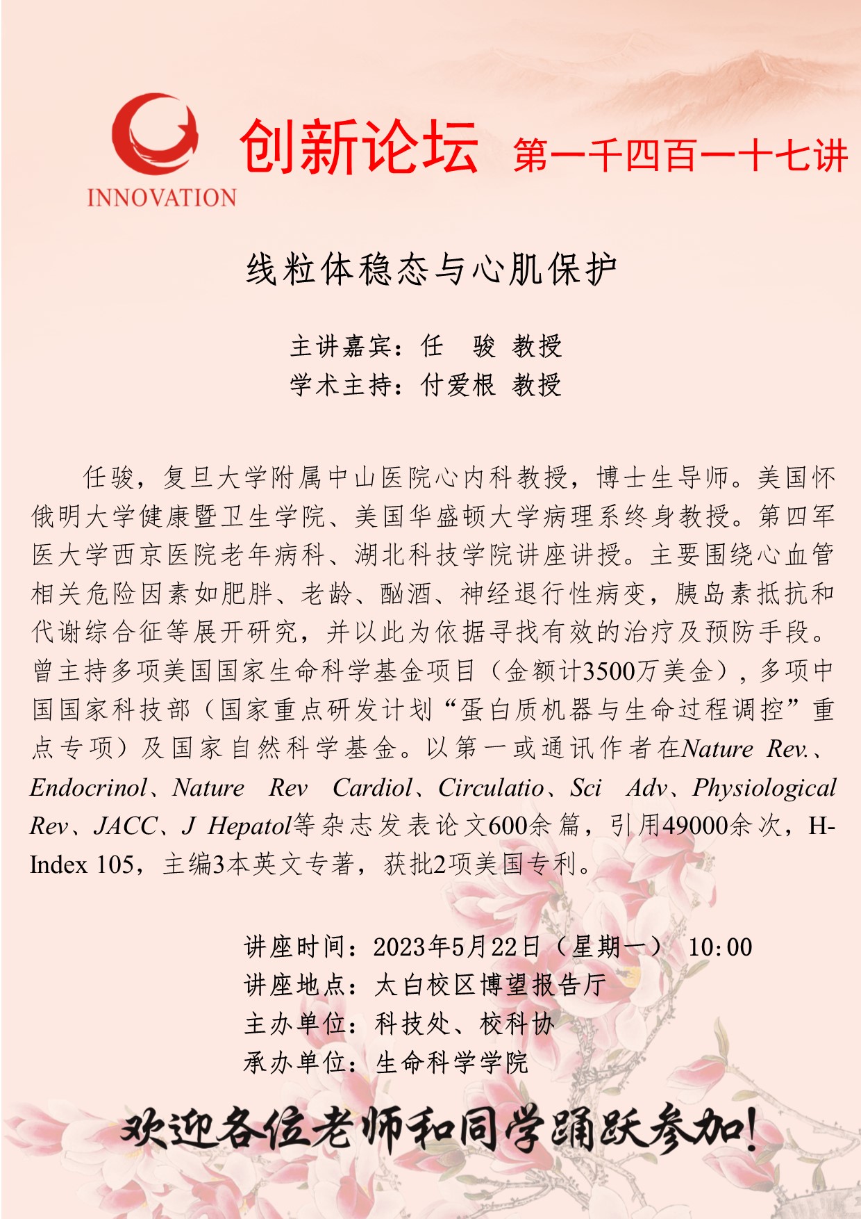 任骏 教授 必赢3003no1线路检测中心创新论坛第一千四百一十七讲:线粒体稳态与心肌保护 讲座时间 2023年5月22日(星期一) 10:00 讲座地点 太白校区博望报告厅 讲座人介绍 任骏 教授 讲座内容