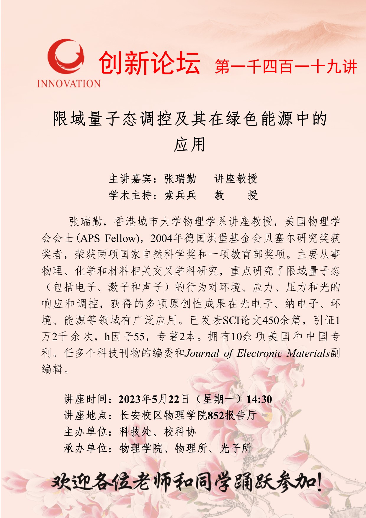 张瑞勤 讲座教授 必赢3003no1线路检测中心创新论坛第一千四百一十九讲:限域量子态调控及其在绿色能源中的应用 讲座时间 2023年5月22日(星期一)14:30 讲座地点 长安校区物理学院852报告厅 讲座人介绍 张瑞勤 讲座教授 讲座内容
