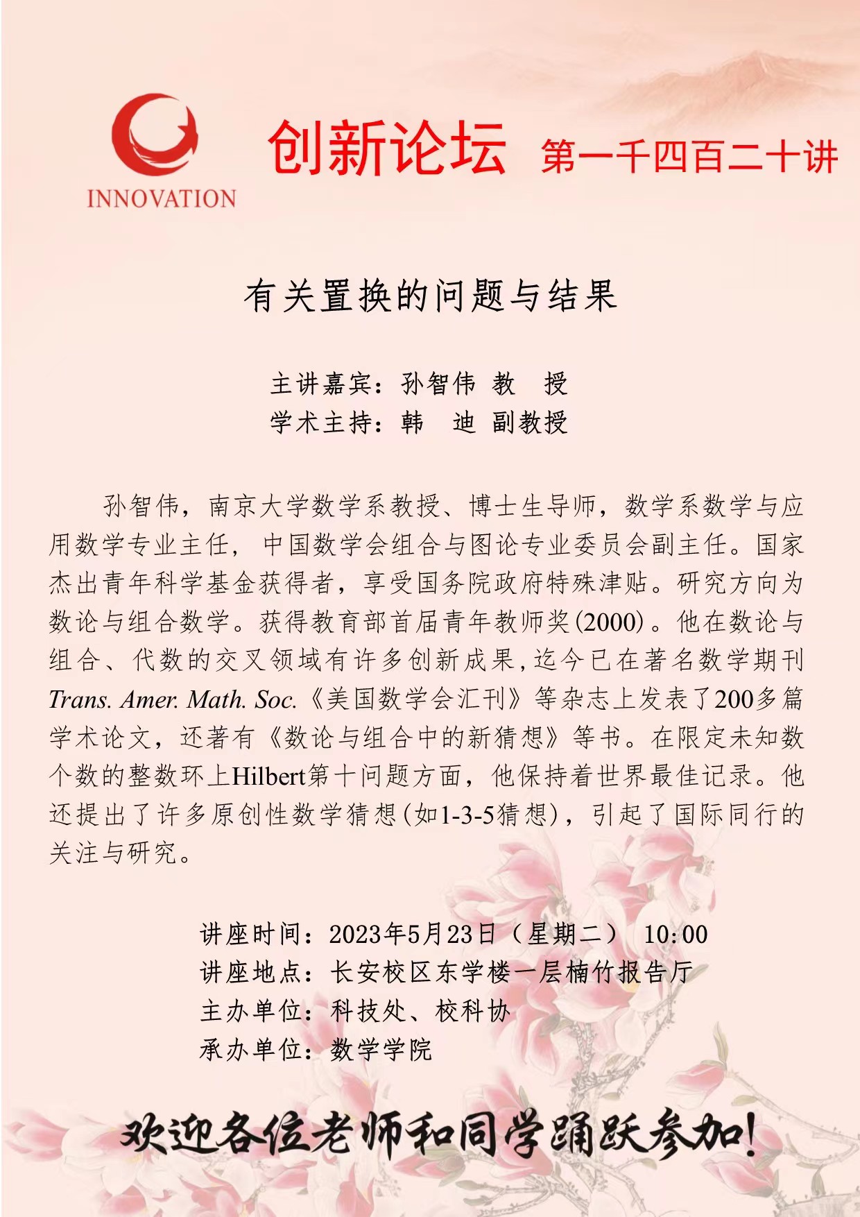 孙智伟 教 授 必赢3003no1线路检测中心创新论坛第一千四百二十讲:有关置换的问题与结果 讲座时间 2023年5月23日(星期二) 10:00 讲座地点 长安校区东学楼一层楠竹报告厅 讲座人介绍 孙智伟 教 授 讲座内容