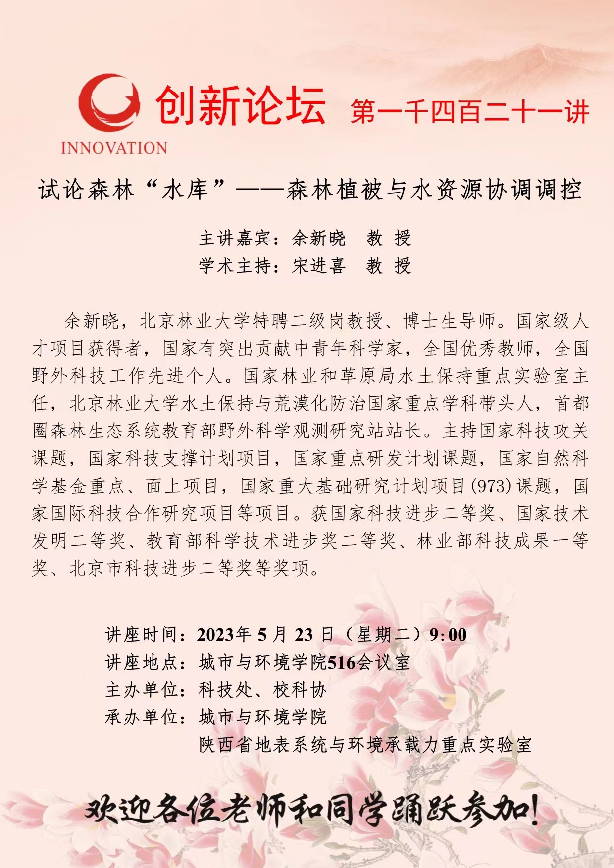 余新晓 教 授 必赢3003no1线路检测中心创新论坛第一千四百二十一讲:试论森林“水库”——森林植被与水资源协调调控 讲座时间 2023年5月23日(星期二)9:00 讲座地点 城市与环境学院516会议室 讲座人介绍 余新晓 教 授 讲座内容