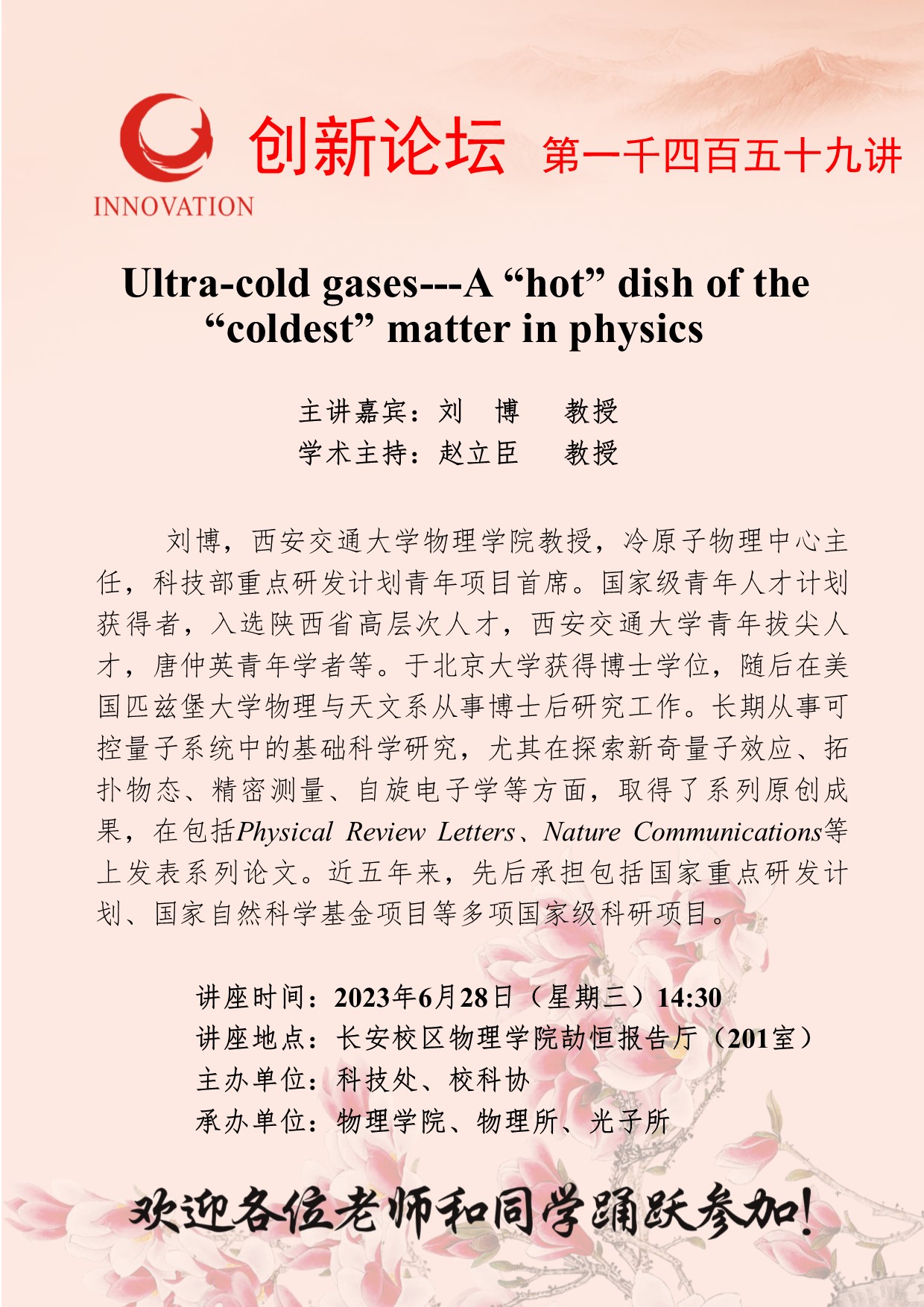 刘 博 教授 必赢3003no1线路检测中心创新论坛第一千四百五十九讲:Ultra-cold gases---A “hot” dish of the “coldest” matter in physics 讲座时间 2023年6月28日(星期三)14:30 讲座地点 长安校区物理学院劼恒报告厅(201室) 讲座人介绍 刘 博 教授 讲座内容