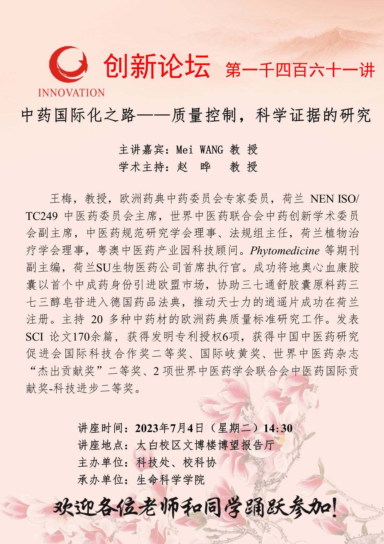 Mei WANG 教授 必赢3003no1线路检测中心创新论坛第一千四百六十一讲:中药国际化之路——质量控制,科学证据的研究 讲座时间 2023年7月4日(星期二)14:30 讲座地点 太白校区文博楼博望报告厅 讲座人介绍 Mei WANG 教授 讲座内容