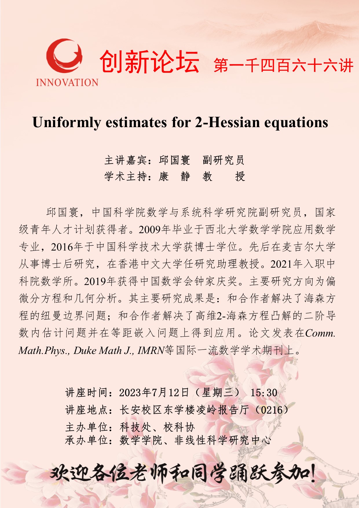 邱国寰 副研究员 必赢3003no1线路检测中心创新论坛第一千四百六十六讲:Uniformly estimates for 2-Hessian equations 讲座时间 2023年7月12日(星期三) 15:30 讲座地点 长安校区东学楼凌岭报告厅(0216) 讲座人介绍 邱国寰 副研究员 讲座内容