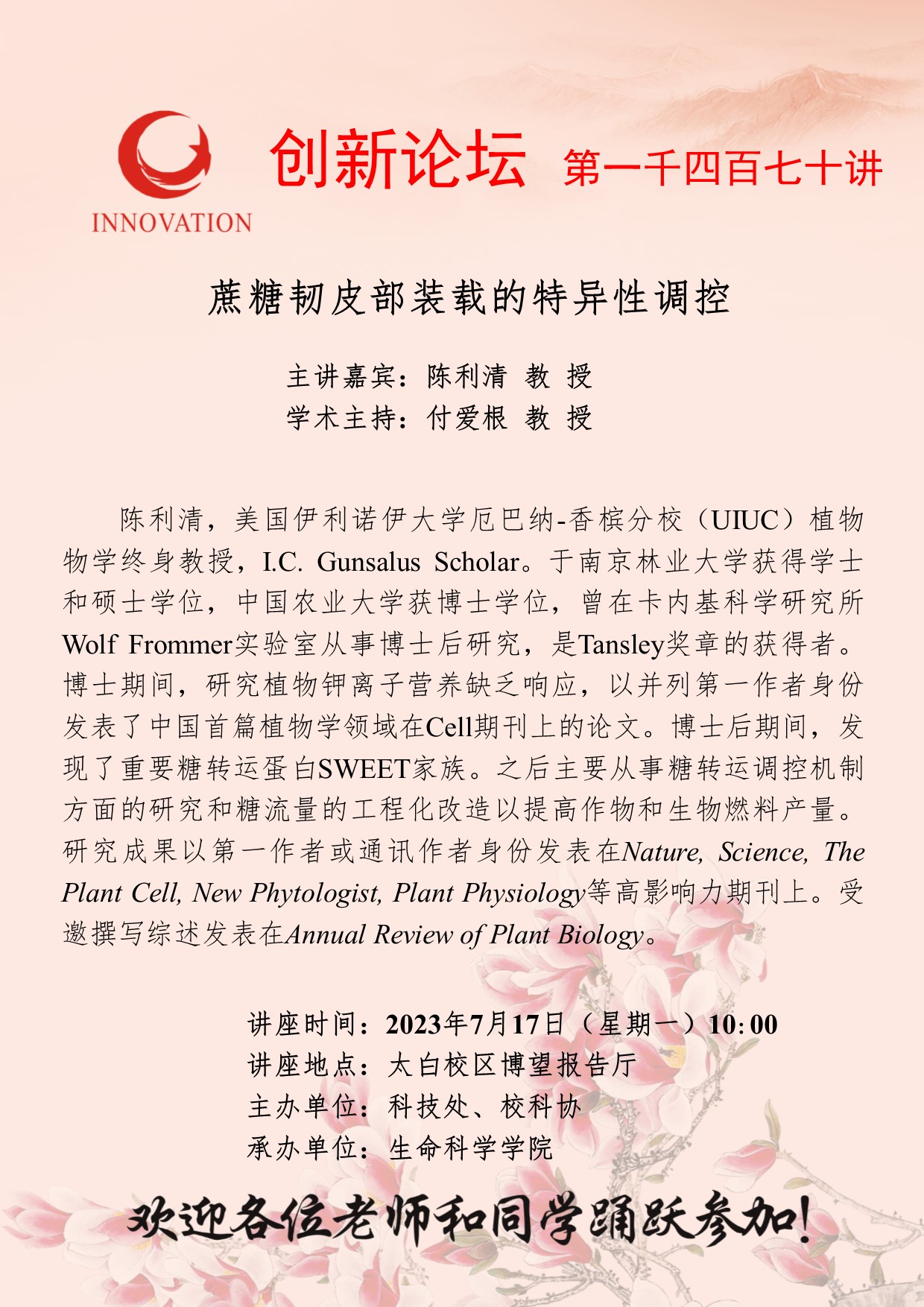 陈利清 教授 必赢3003no1线路检测中心创新论坛第一千四百七十讲:蔗糖韧皮部装载的特异性调控 讲座时间 2023年7月17日(星期一)10:00 讲座地点 太白校区博望报告厅 讲座人介绍 陈利清 教授 讲座内容