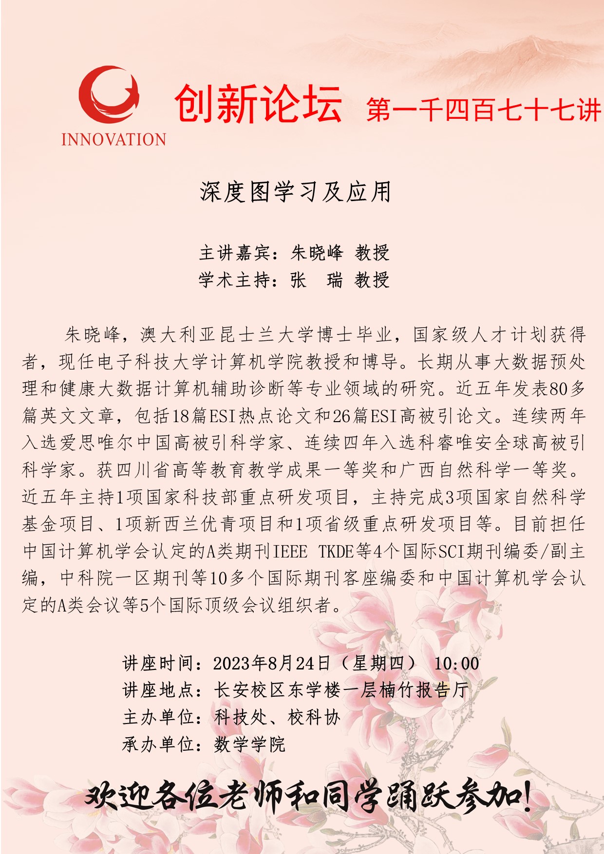 朱晓峰 教授 必赢3003no1线路检测中心创新论坛第一千四百七十七讲:深度图学习及应用 讲座时间 2023年8月24日(星期四) 10:00 讲座地点 长安校区东学楼一层楠竹报告厅 讲座人介绍 朱晓峰 教授 讲座内容