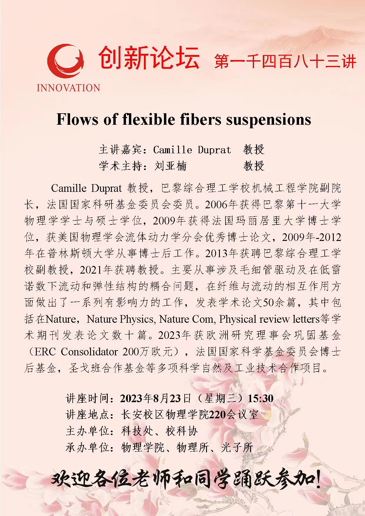 Camille Duprat 教授 必赢3003no1线路检测中心创新论坛第一千四百八十三讲:Flows of flexible fibers suspensions 讲座时间 2023年8月23日(星期三) 15:30 讲座地点 长安校区物理学院220会议室 讲座人介绍 Camille Duprat 教授 讲座内容