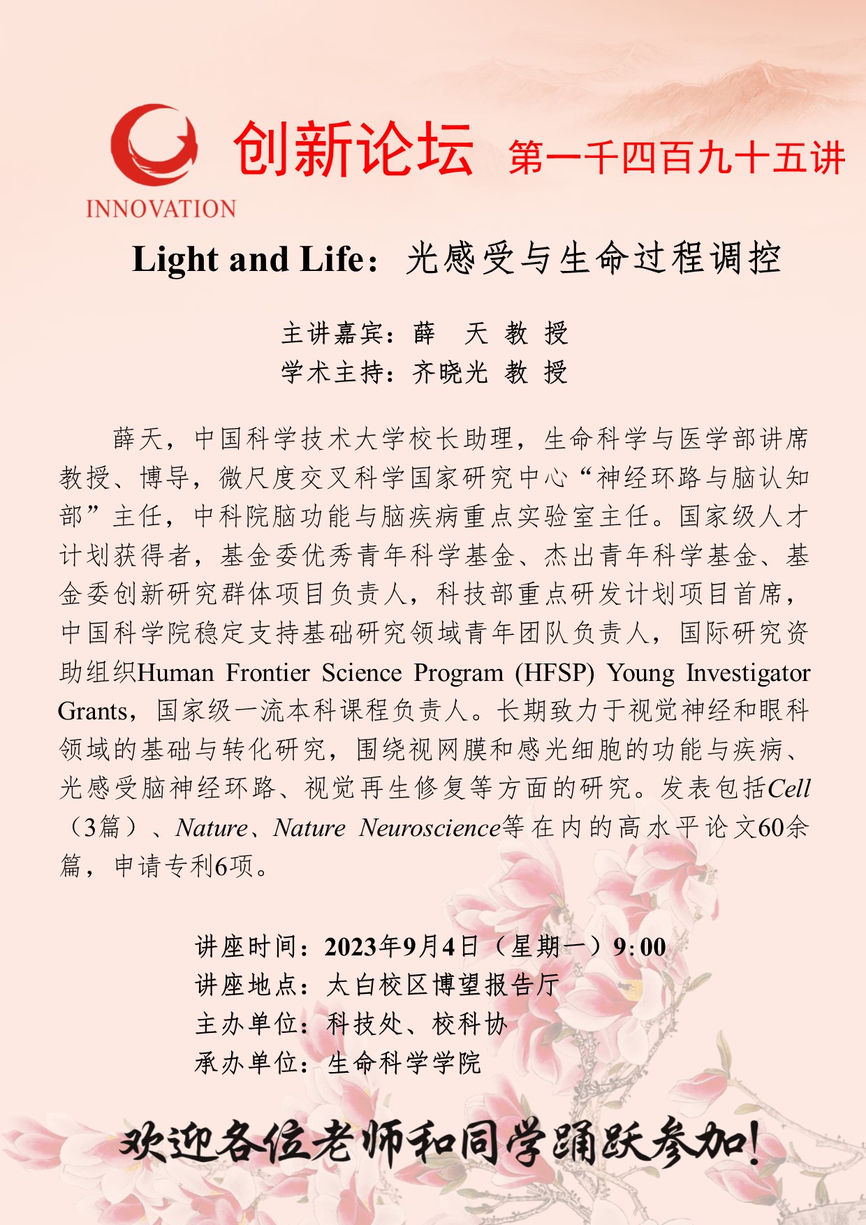 薛天 教授 必赢3003no1线路检测中心创新论坛第一千四百九十五讲:Light and Life:光感受与生命过程调控 讲座时间 2023年9月4日(星期一)9:00 讲座地点 太白校区博望报告厅 讲座人介绍 薛天 教授 讲座内容