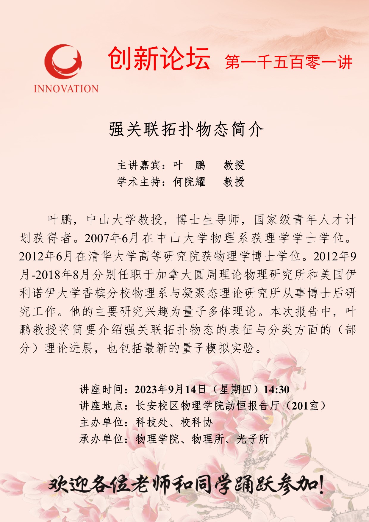 叶鹏 教授 必赢3003no1线路检测中心创新论坛第一千五百零一讲:强关联拓扑物态简介 讲座时间 2023年9月14日(星期四)14:30 讲座地点 长安校区物理学院劼恒报告厅(201室) 讲座人介绍 叶鹏 教授 讲座内容