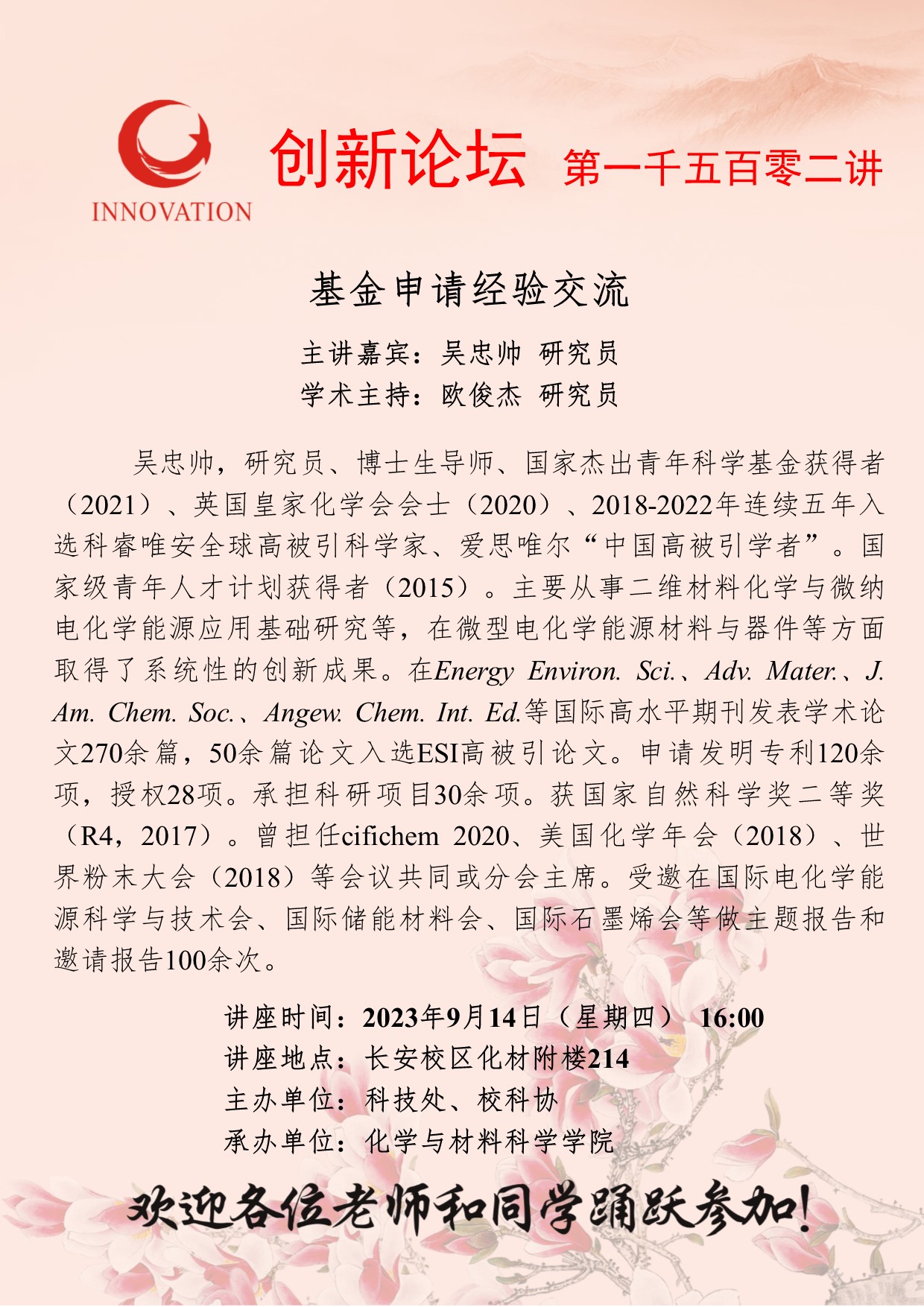 吴忠帅 研究员 必赢3003no1线路检测中心创新论坛第一千五百零二讲: 基金申请经验交流 讲座时间 2023年9月14日(星期四) 16:00 讲座地点 长安校区化材附楼214 讲座人介绍 吴忠帅 研究员 讲座内容