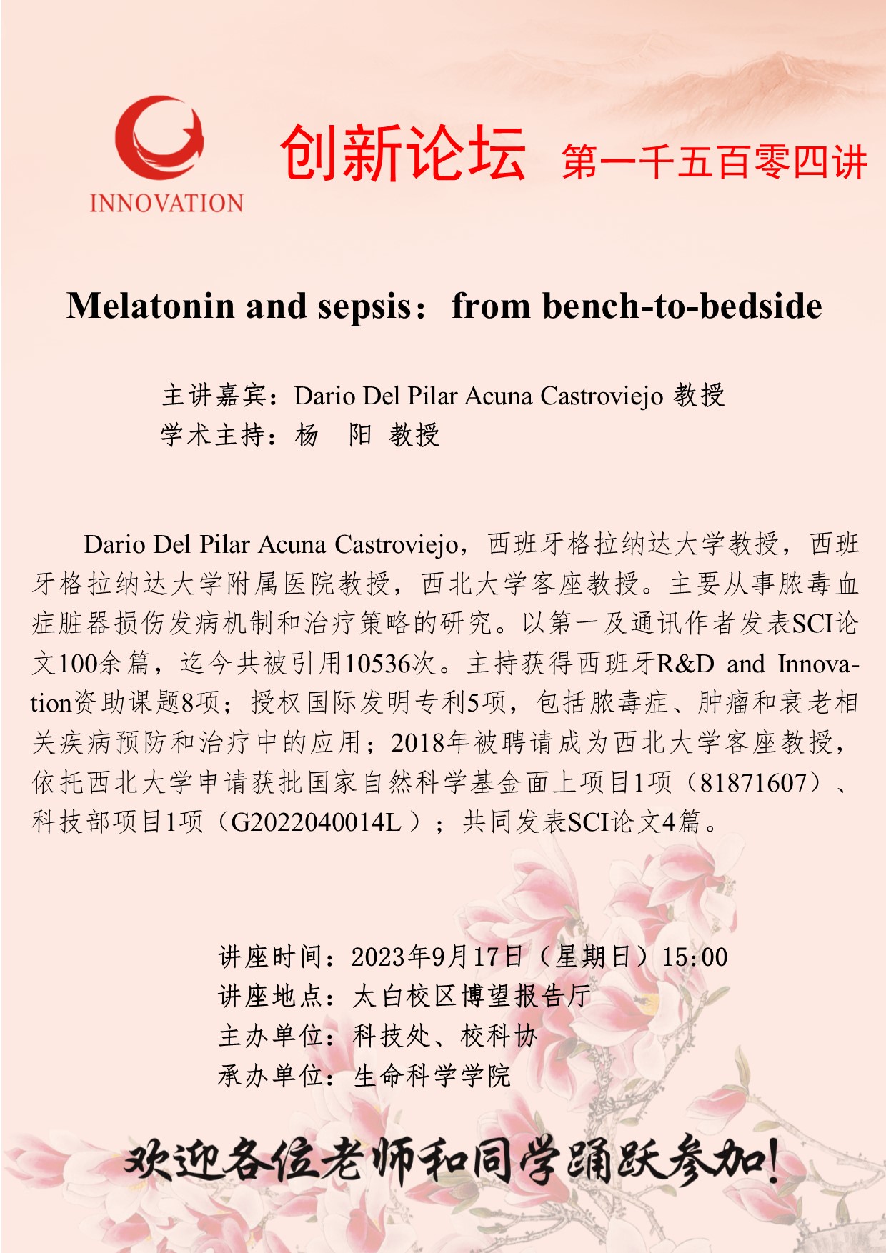 Dario Del Pilar Acuna Castroviejo 教授 必赢3003no1线路检测中心创新论坛第一千五百零四讲:Melatonin and sepsis:from bench-to-bedside 讲座时间 2023年9月17日(星期日)15:00 讲座地点 太白校区博望报告厅 讲座人介绍 Dario Del Pilar Acuna Castroviejo 教授 讲座内容