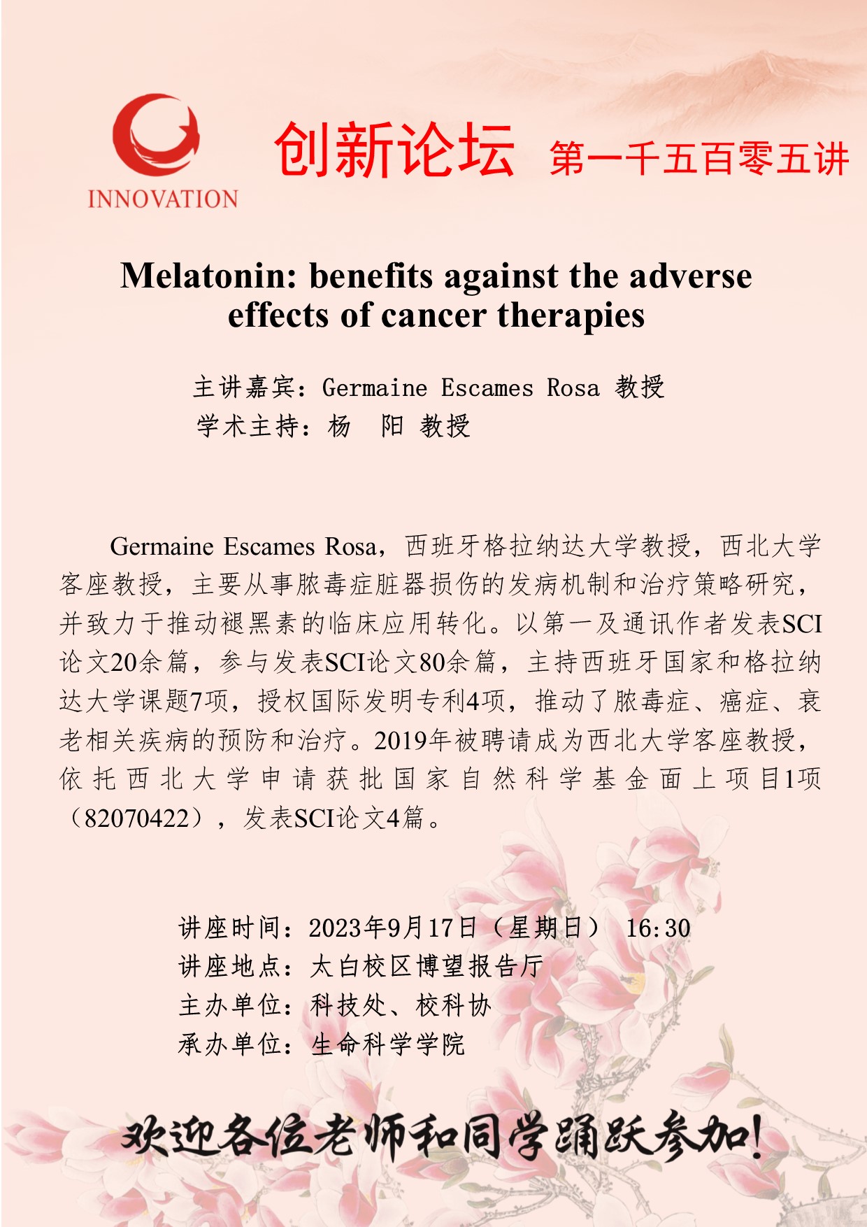 Germaine Escames Rosa 教授 必赢3003no1线路检测中心创新论坛第一千五百零五讲:Melatonin: benefits against the adverse effects of cancer therapies 讲座时间 2023年9月17日(星期日) 16:30 讲座地点 太白校区博望报告厅 讲座人介绍 Germaine Escames Rosa 教授 讲座内容