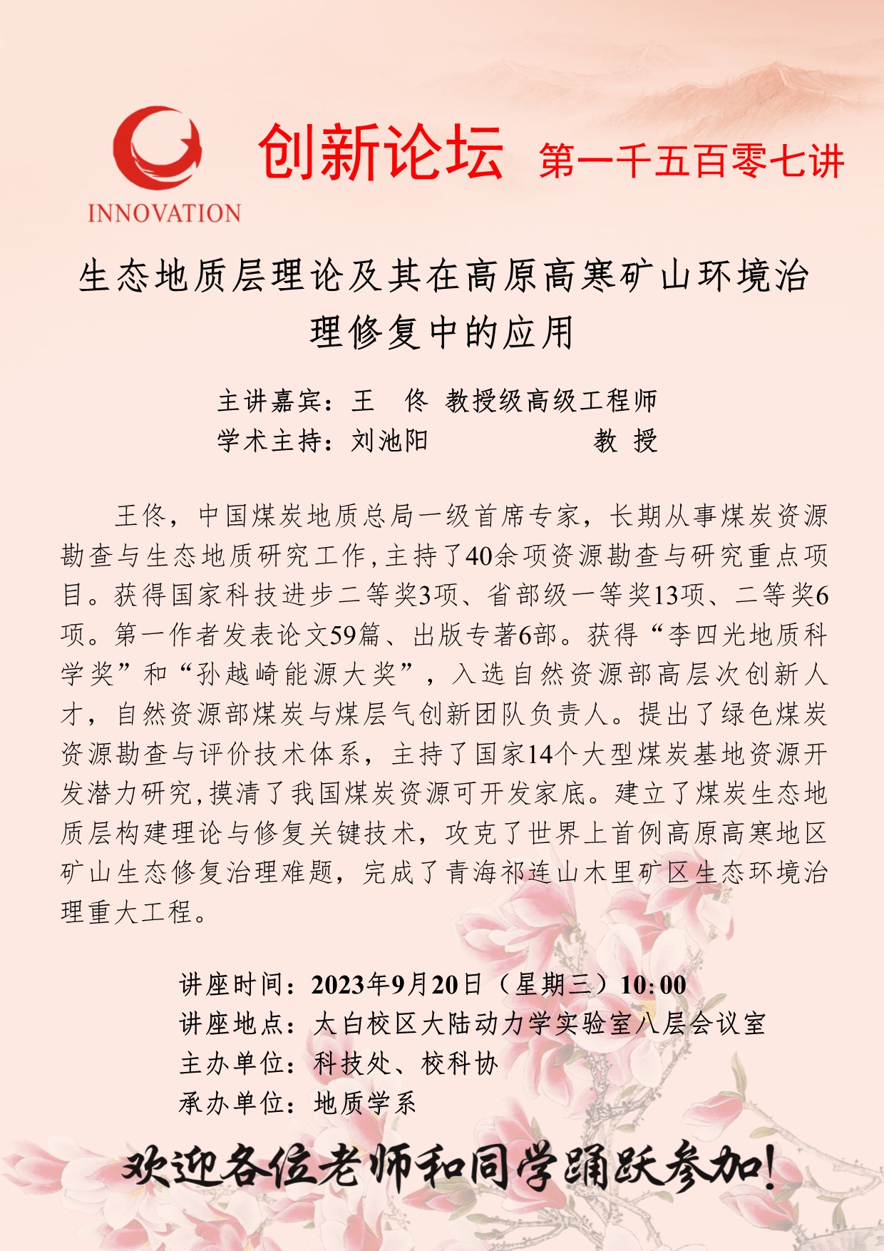 王佟 教授级高级工程师 必赢3003no1线路检测中心创新论坛第一千五百零七讲:生态地质层理论及其在高原高寒矿山环境治理修复中的应用 讲座时间 2023年9月20日(星期三)10:00 讲座地点 太白校区大陆动力学实验室八层会议室 讲座人介绍 王佟 教授级高级工程师 讲座内容