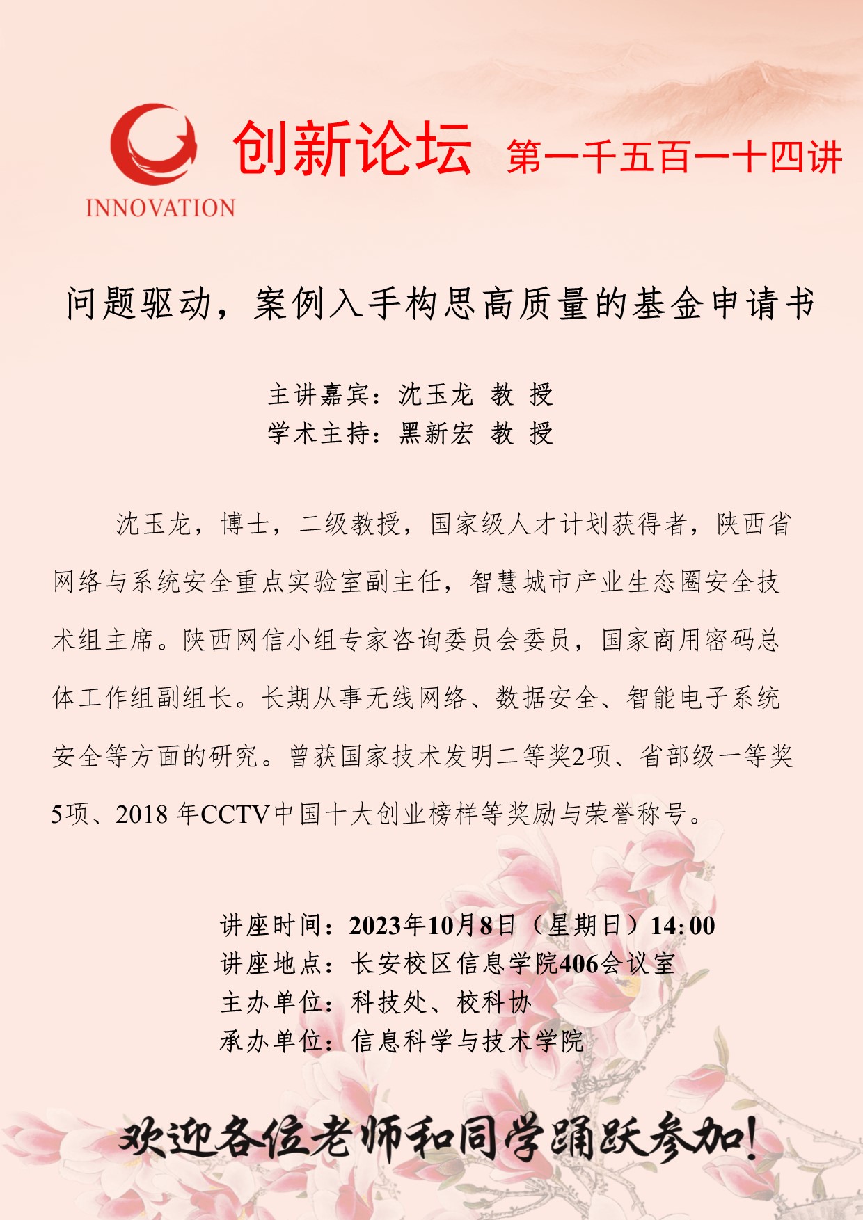 沈玉龙 教 授 必赢3003no1线路检测中心创新论坛第一千五百一十四讲: 问题驱动,案例入手构思高质量的基金申请书 讲座时间 2023年10月8日(星期日)14:00 讲座地点 长安校区信息学院406会议室 讲座人介绍 沈玉龙 教 授 讲座内容