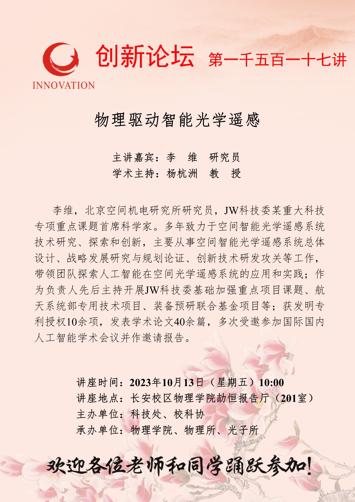 李维 研究员 必赢3003no1线路检测中心创新论坛第一千五百一十七讲:物理驱动智能光学遥感 讲座时间 2023年10月13日(星期五)10:00 讲座地点 长安校区物理学院劼恒报告厅(201室) 讲座人介绍 李维 研究员 讲座内容