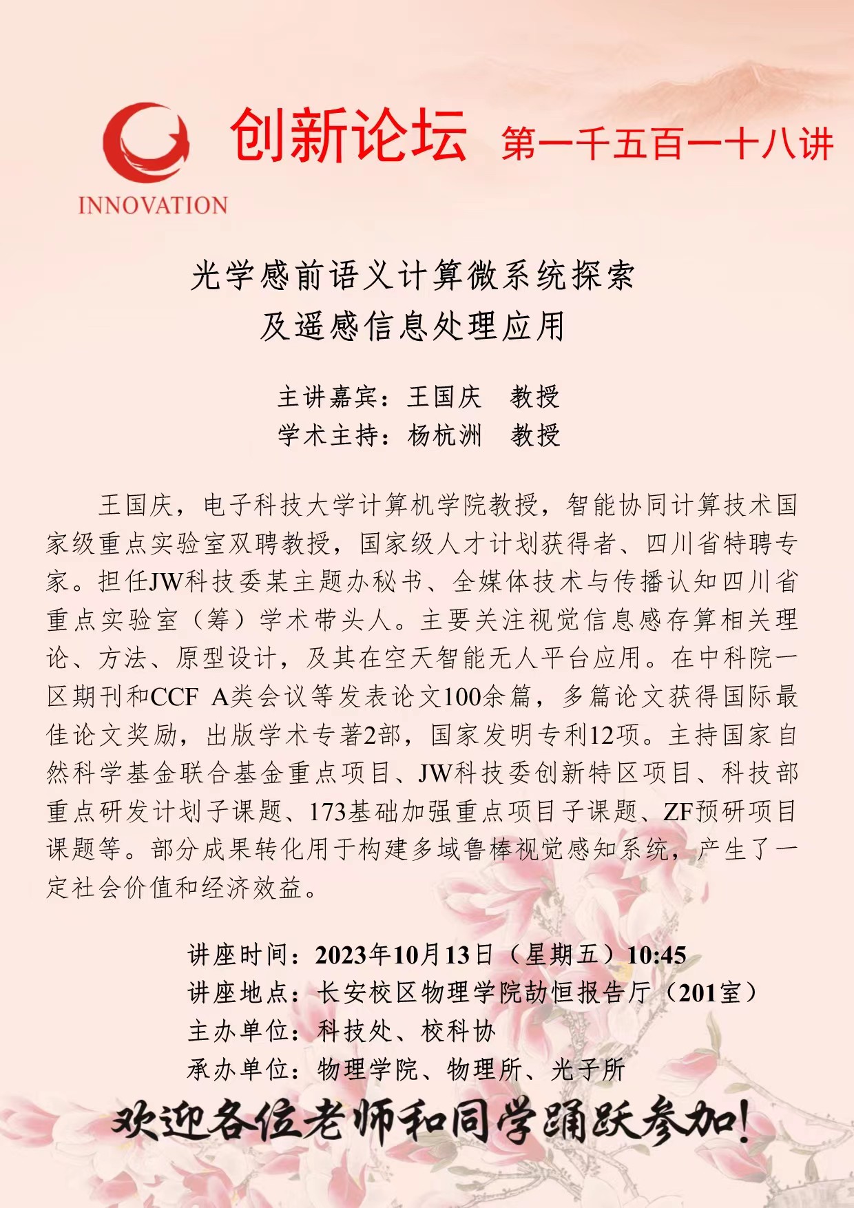 王国庆 教授 必赢3003no1线路检测中心创新论坛第一千五百一十八讲:光学感前语义计算微系统探索及遥感信息处理应用 讲座时间 2023年10月13日(星期五)10:45 讲座地点 长安校区物理学院劼恒报告厅(201室) 讲座人介绍 王国庆 教授 讲座内容