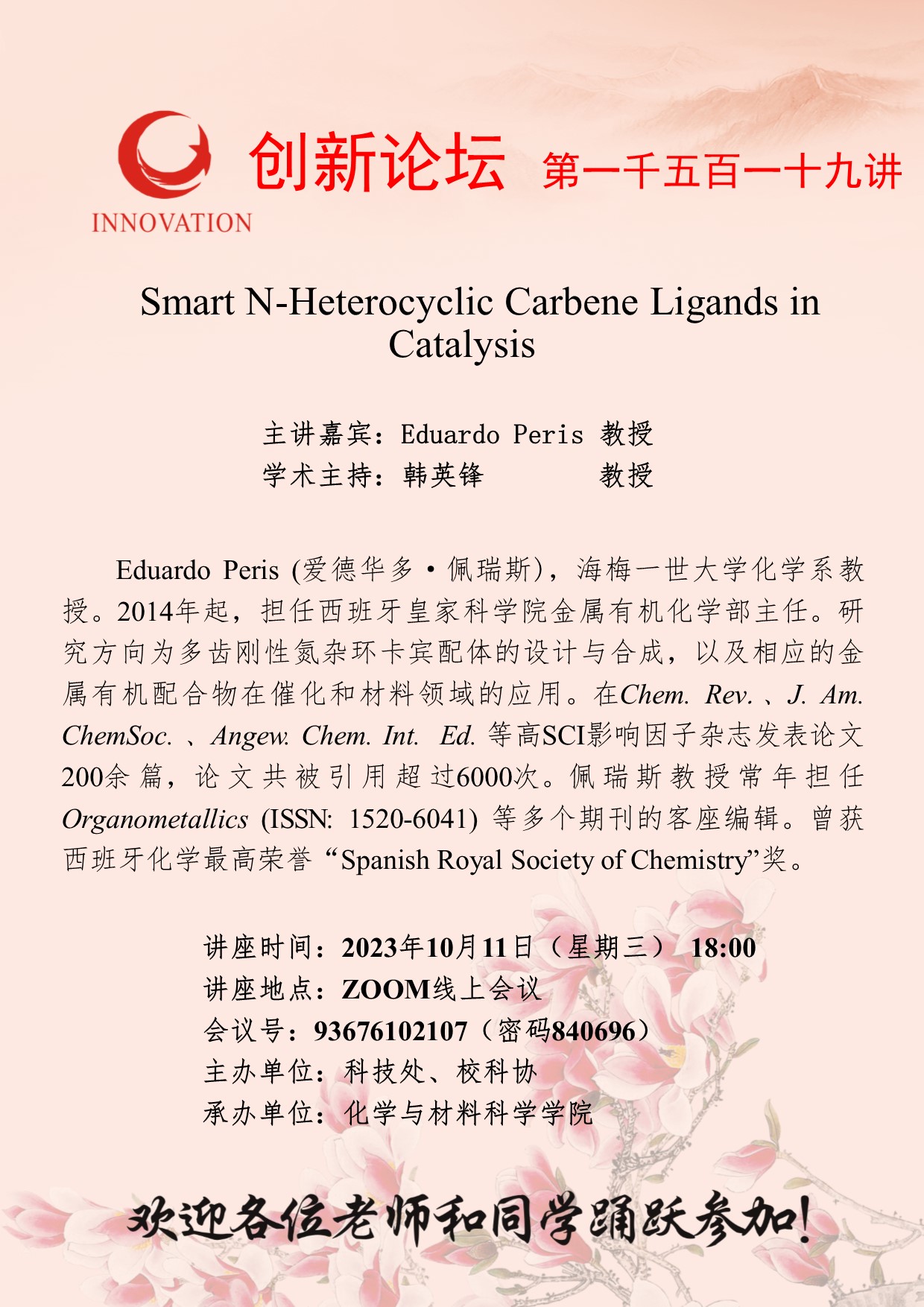Eduardo Peris 教授 必赢3003no1线路检测中心创新论坛第一千五百一十九讲: Smart N-Heterocyclic Carbene Ligands in Catalysis 讲座时间 2023年10月11日(星期三) 18:00 讲座地点 ZOOM线上会议 讲座人介绍 Eduardo Peris 教授 讲座内容