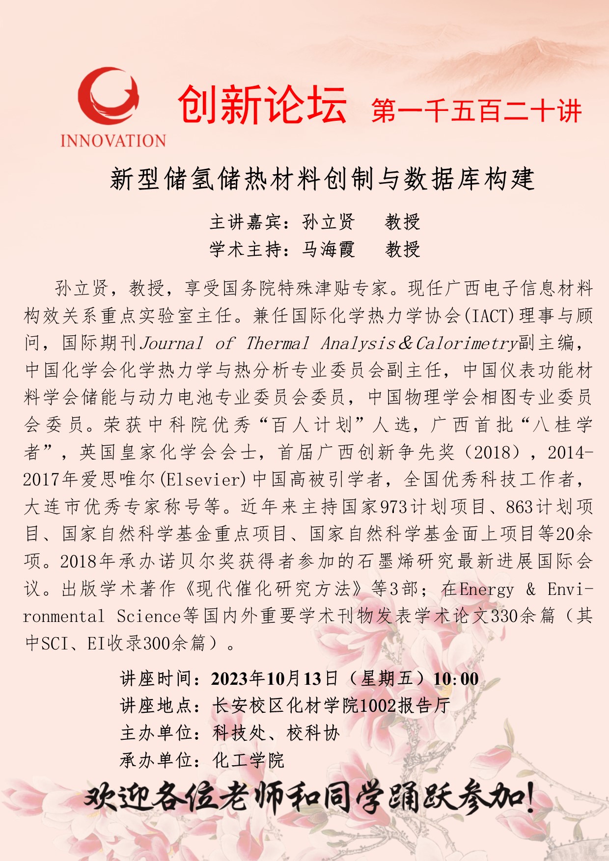 孙立贤 教授 必赢3003no1线路检测中心创新论坛第一千五百二十讲:新型储氢储热材料创制与数据库构建 讲座时间 2023年10月13日(星期五)10:00 讲座地点 长安校区化材学院1002报告厅 讲座人介绍 孙立贤 教授 讲座内容