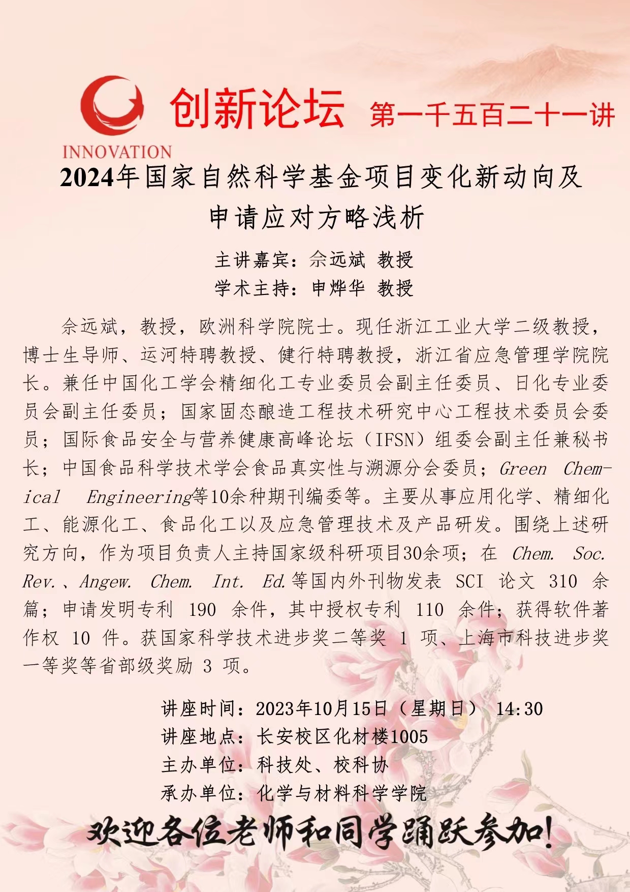 佘远斌 教授 必赢3003no1线路检测中心创新论坛第一千五百二十一讲: 2024年国家自然科学基金项目变化新动向及申请应对方略浅析 讲座时间 2023年10月15日(星期日) 14:30 讲座地点 长安校区化材楼1005 讲座人介绍 佘远斌 教授 讲座内容