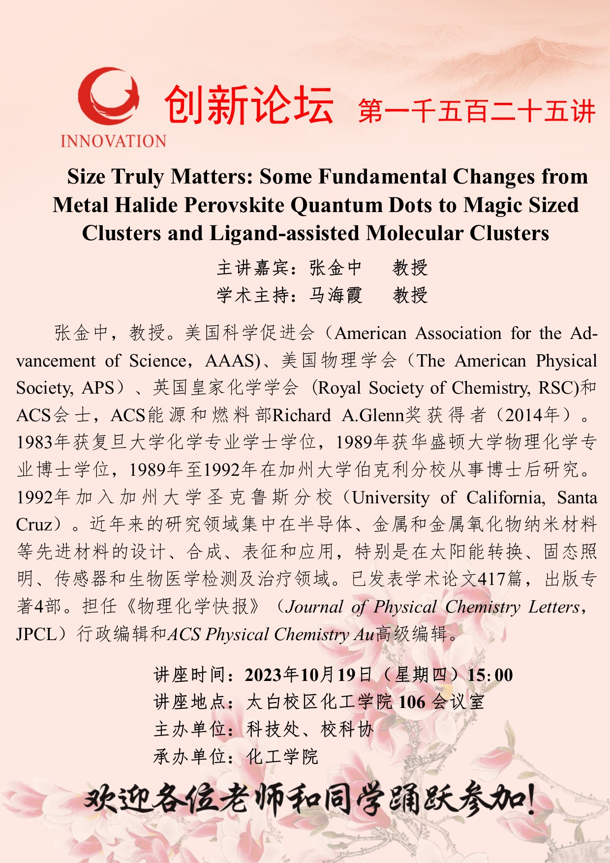 张金中 教授 必赢3003no1线路检测中心创新论坛第一千五百二十五讲:Size Truly Matters: Some Fundamental Changes from Metal Halide Perovskite Quantum Dots to Magic Sized Clusters and Ligand-assisted Molecular Clusters 讲座时间 2023年10月19日(星期四)15:00 讲座地点 太白校区化工学院106会议室 讲座人介绍 张金中 教授 讲座内容