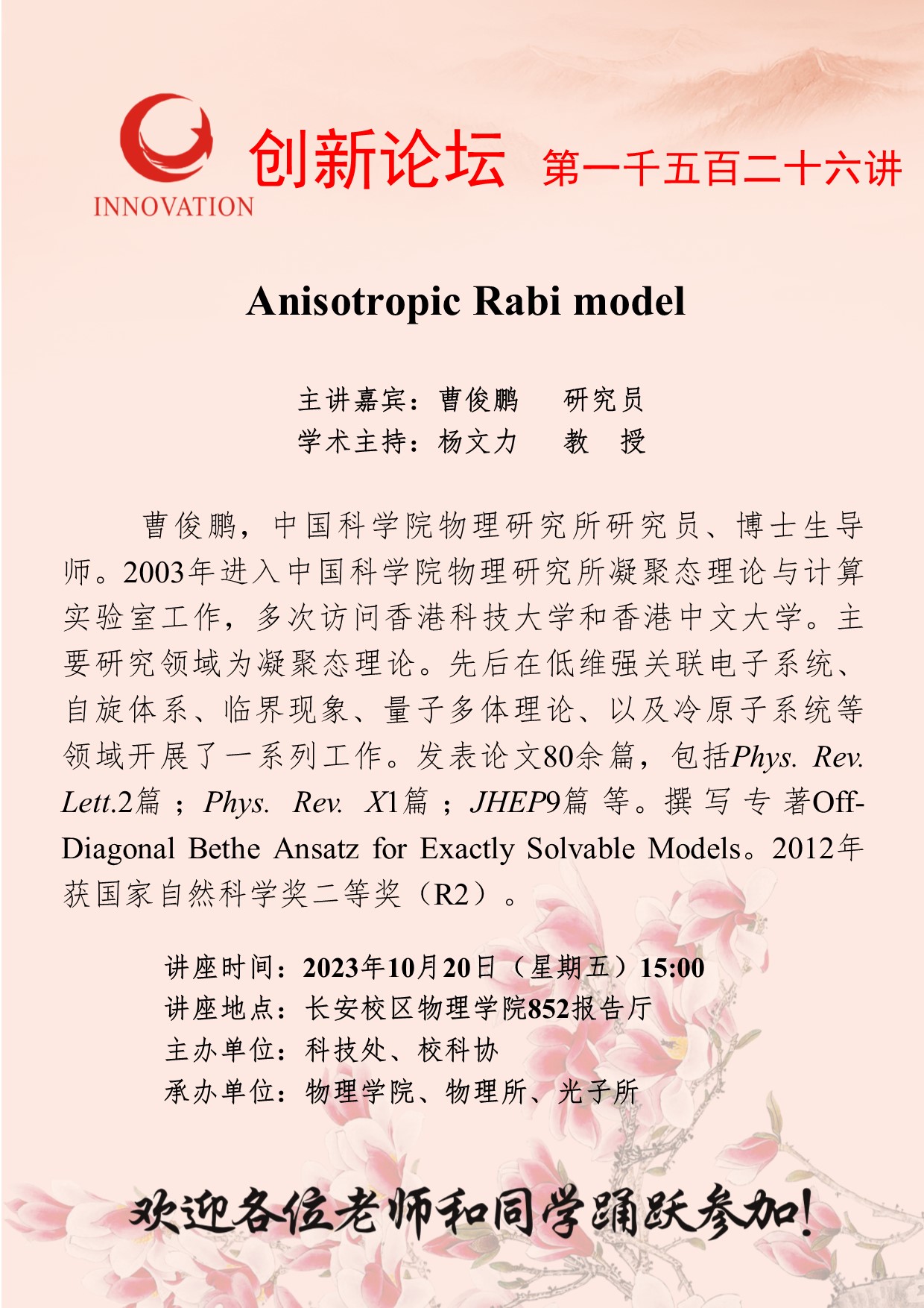 曹俊鹏 研究员 必赢3003no1线路检测中心创新论坛第一千五百二十六讲:Anisotropic Rabi model 讲座时间 2023年10月20日(星期五)15:00 讲座地点 长安校区物理学院852报告厅 讲座人介绍 曹俊鹏 研究员 讲座内容