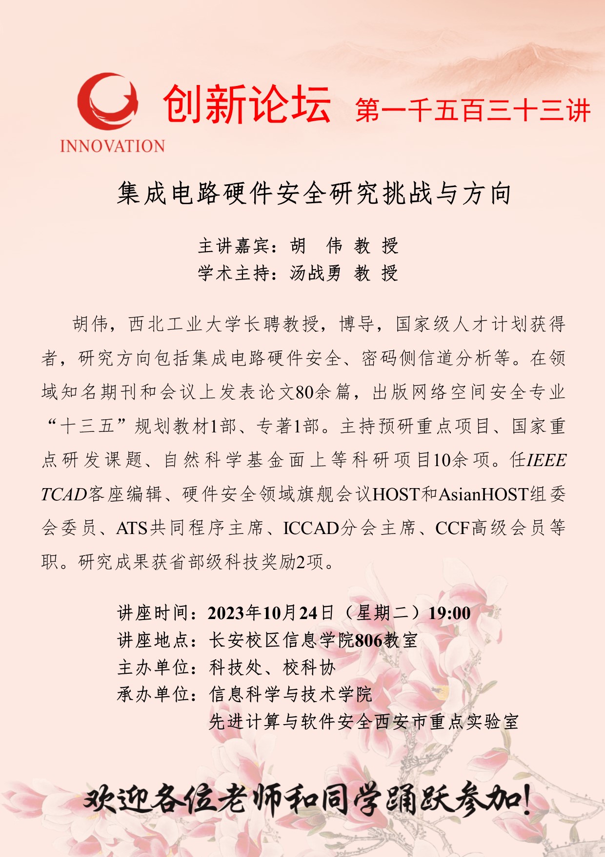 胡 伟 教授 必赢3003no1线路检测中心创新论坛第一千五百三十三讲:集成电路硬件安全研究挑战与方向 讲座时间 2023年10月24日(星期二)19:00 讲座地点 长安校区信息学院806教室 讲座人介绍 胡 伟 教授 讲座内容
