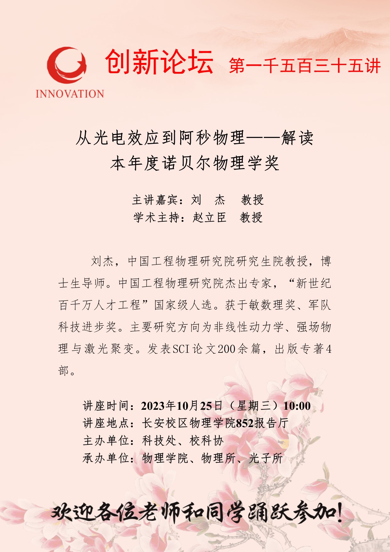 刘 杰 教授 必赢3003no1线路检测中心创新论坛第一千五百三十五讲:从光电效应到阿秒物理——解读 本年度诺贝尔物理学奖 讲座时间 2023年10月25日(星期三)10:00 讲座地点 长安校区物理学院852报告厅 讲座人介绍 刘 杰 教授 讲座内容