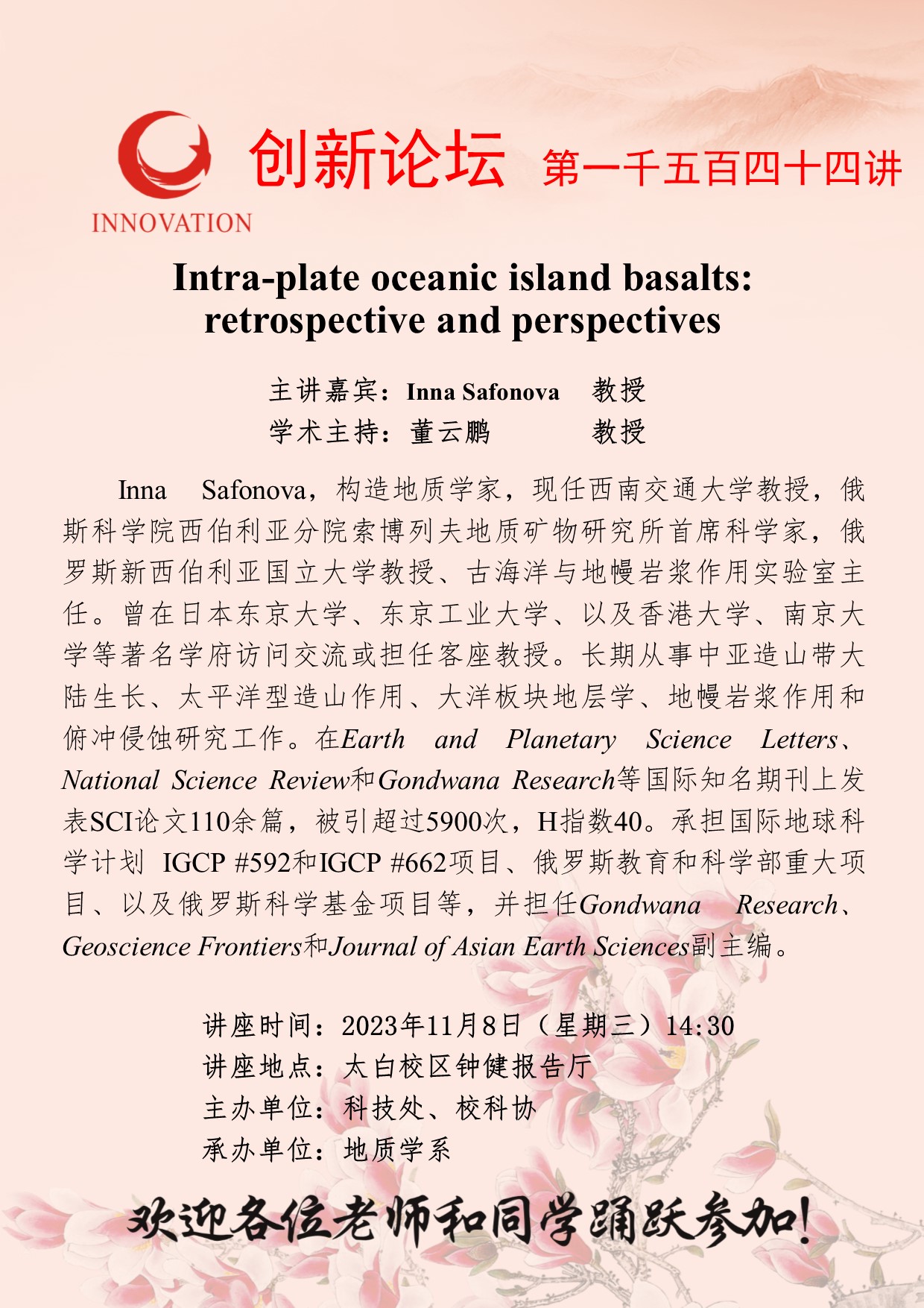 Inna Safonova 教授 必赢3003no1线路检测中心创新论坛第一千五百四十四讲:Intra-plate oceanic island basalts: retrospective and perspectives 讲座时间 2023年11月8日(星期三)14:30 讲座地点 太白校区钟健报告厅 讲座人介绍 Inna Safonova 教授 讲座内容