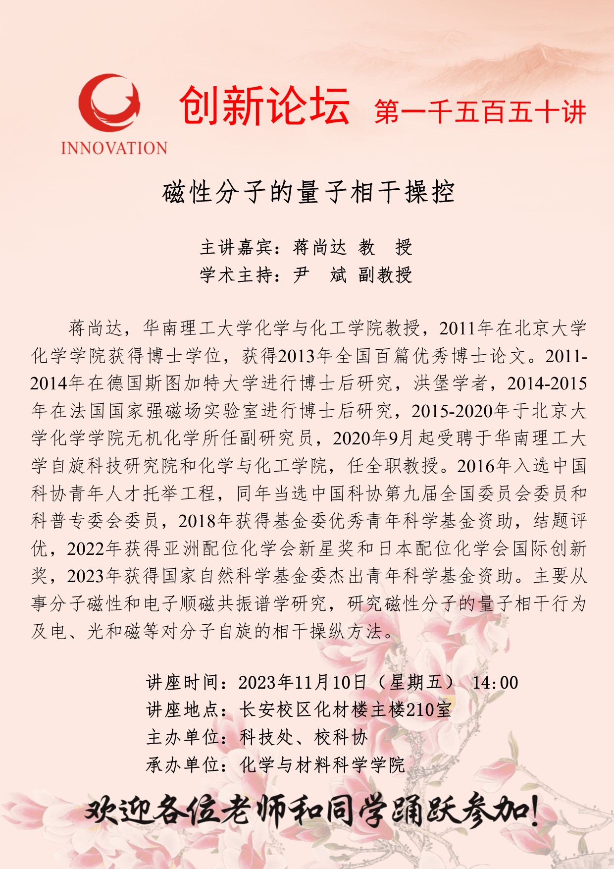 蒋尚达 教 授 必赢3003no1线路检测中心创新论坛第一千五百五十讲: 磁性分子的量子相干操控 讲座时间 2023年11月10日(星期五) 14:00 讲座地点 长安校区化材楼主楼210室 讲座人介绍 蒋尚达 教 授 讲座内容