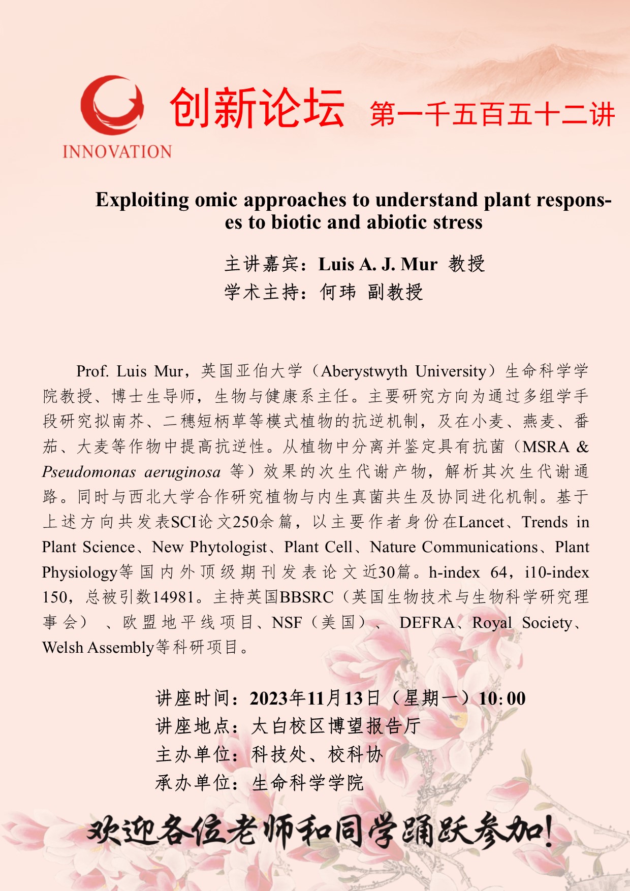 Luis A. J. Mur 教授 必赢3003no1线路检测中心创新论坛第一千五百五十二讲:Exploiting omic approaches to understand plant responses to biotic and abiotic stress 讲座时间 2023年11月13日(星期一)10:00 讲座地点 太白校区博望报告厅 讲座人介绍 Luis A. J. Mur 教授 讲座内容