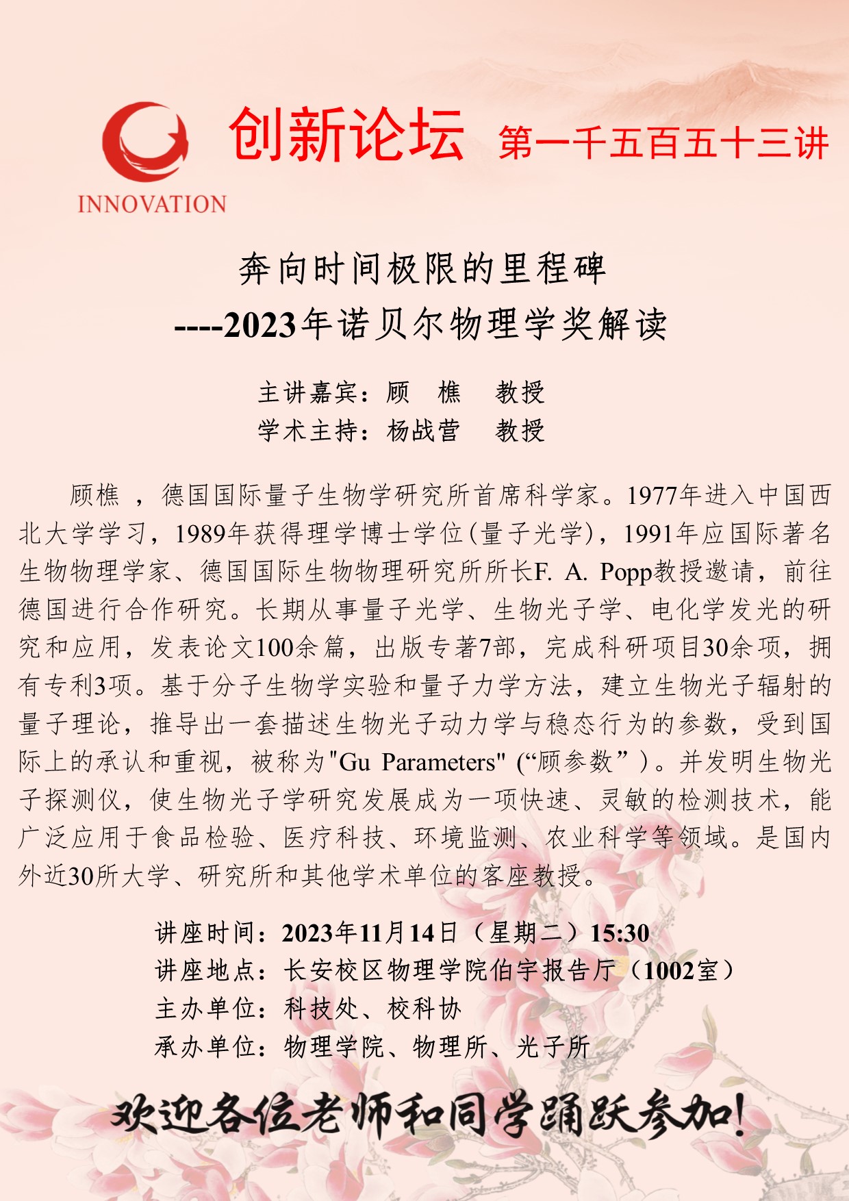 顾樵 教授 必赢3003no1线路检测中心创新论坛第一千五百五十三讲:奔向时间极限的里程碑----2023年诺贝尔物理学奖解读 讲座时间 2023年11月14日(星期二)15:30 讲座地点 长安校区物理学院伯宇报告厅(1002室) 讲座人介绍 顾樵 教授 讲座内容