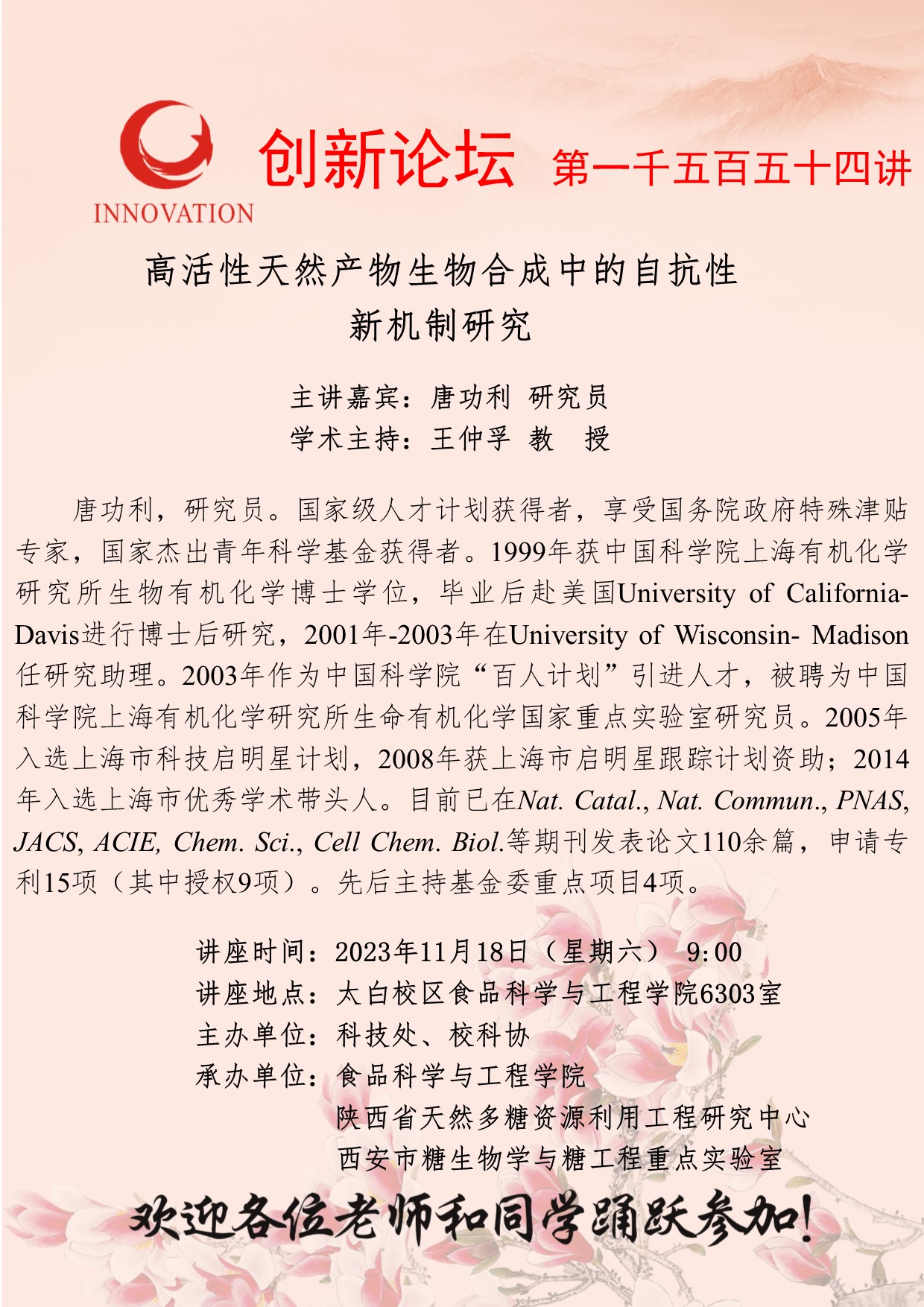 唐功利 研究员 必赢3003no1线路检测中心创新论坛第一千五百五十四讲:高活性天然产物生物合成中的自抗性 新机制研究 讲座时间 2023年11月18日(星期六) 9:00 讲座地点 太白校区食品科学与工程学院6303室 讲座人介绍 唐功利 研究员 讲座内容