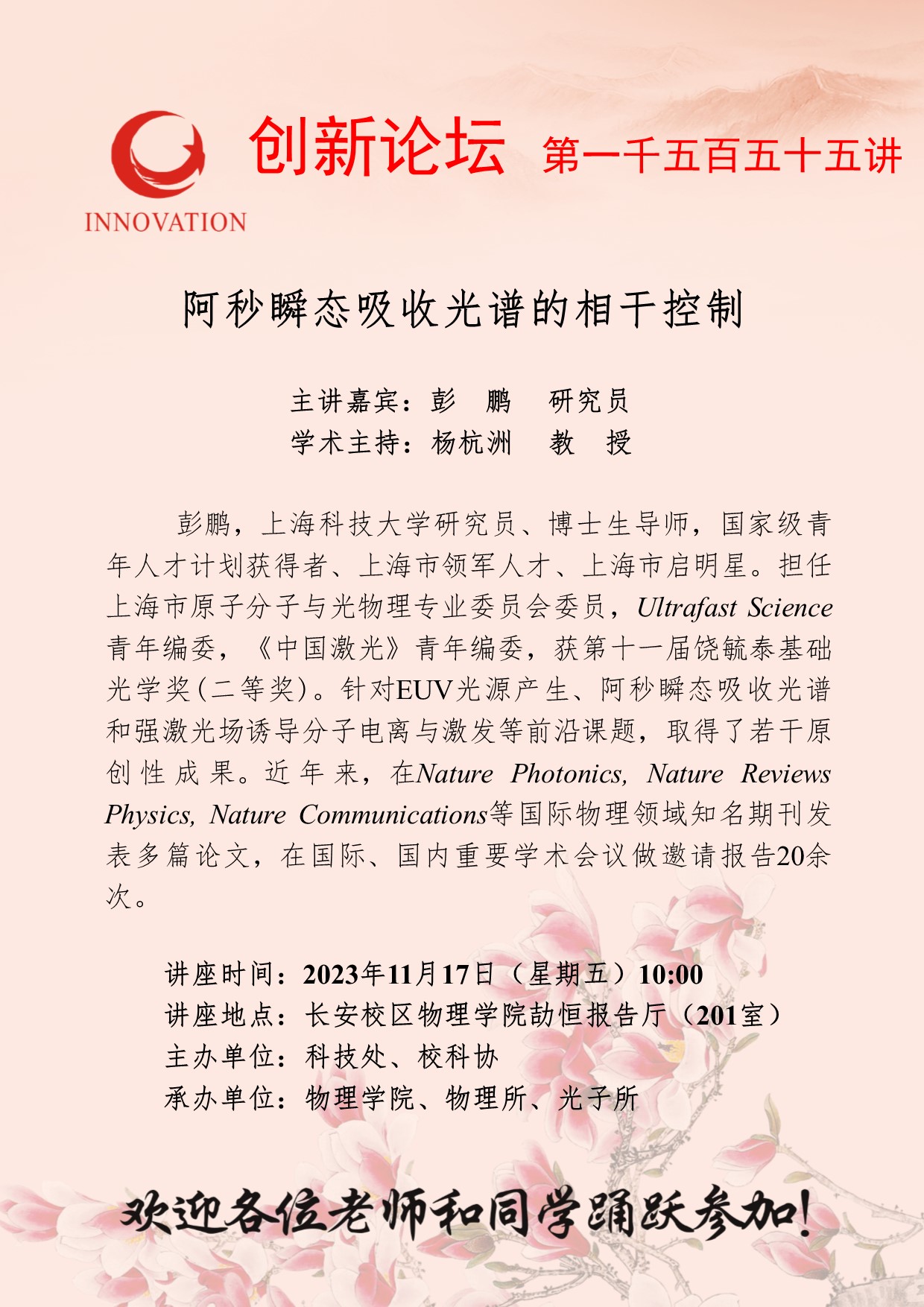 彭鹏 研究员 必赢3003no1线路检测中心创新论坛第一千五百五十五讲:阿秒瞬态吸收光谱的相干控制 讲座时间 2023年11月17日(星期五)10:00 讲座地点 长安校区物理学院劼恒报告厅(201室) 讲座人介绍 彭鹏 研究员 讲座内容