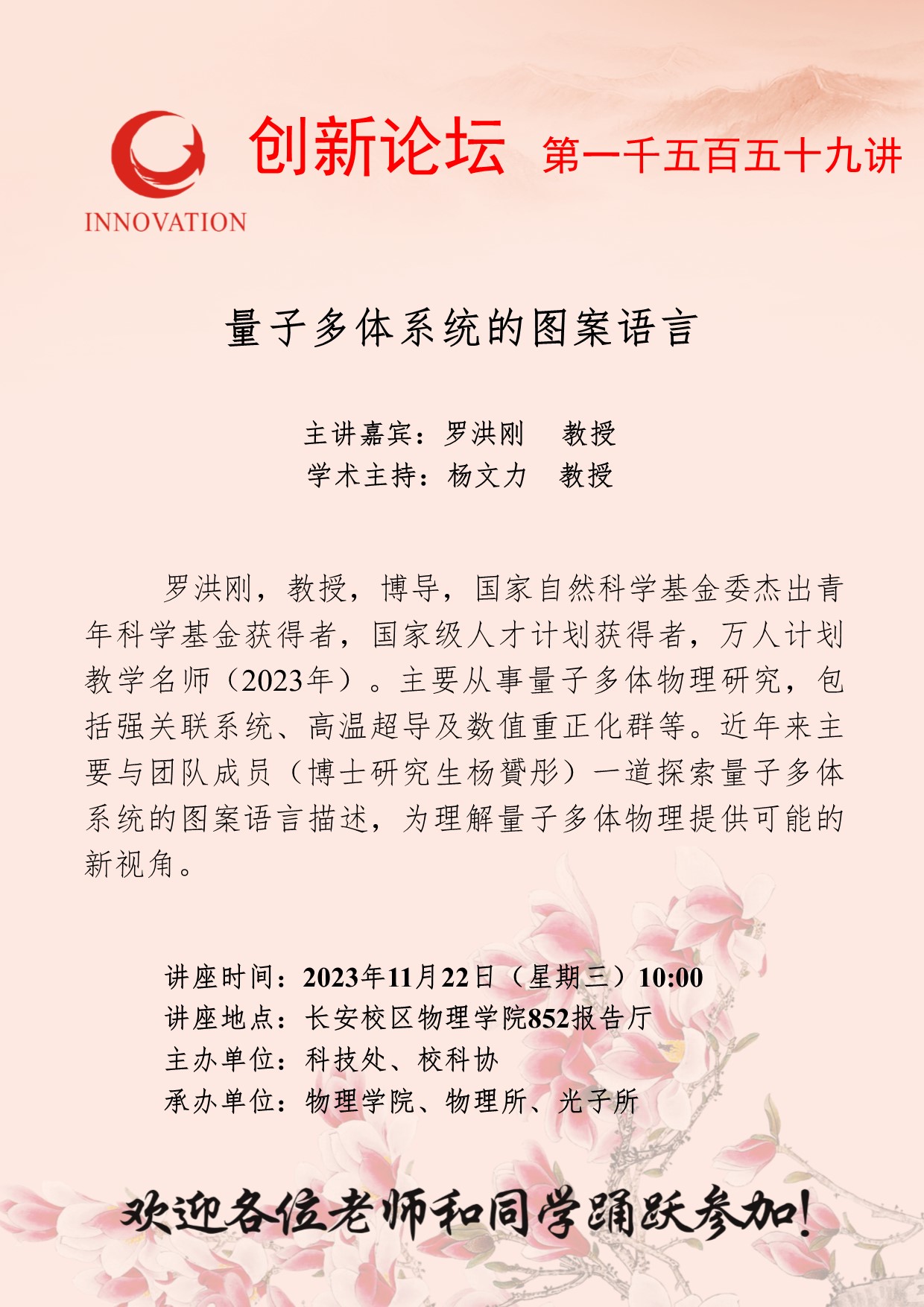 罗洪刚 教授 必赢3003no1线路检测中心创新论坛第一千五百五十九讲:量子多体系统的图案语言 讲座时间 2023年11月22日(星期三)10:00 讲座地点 长安校区物理学院852报告厅 讲座人介绍 罗洪刚 教授 讲座内容