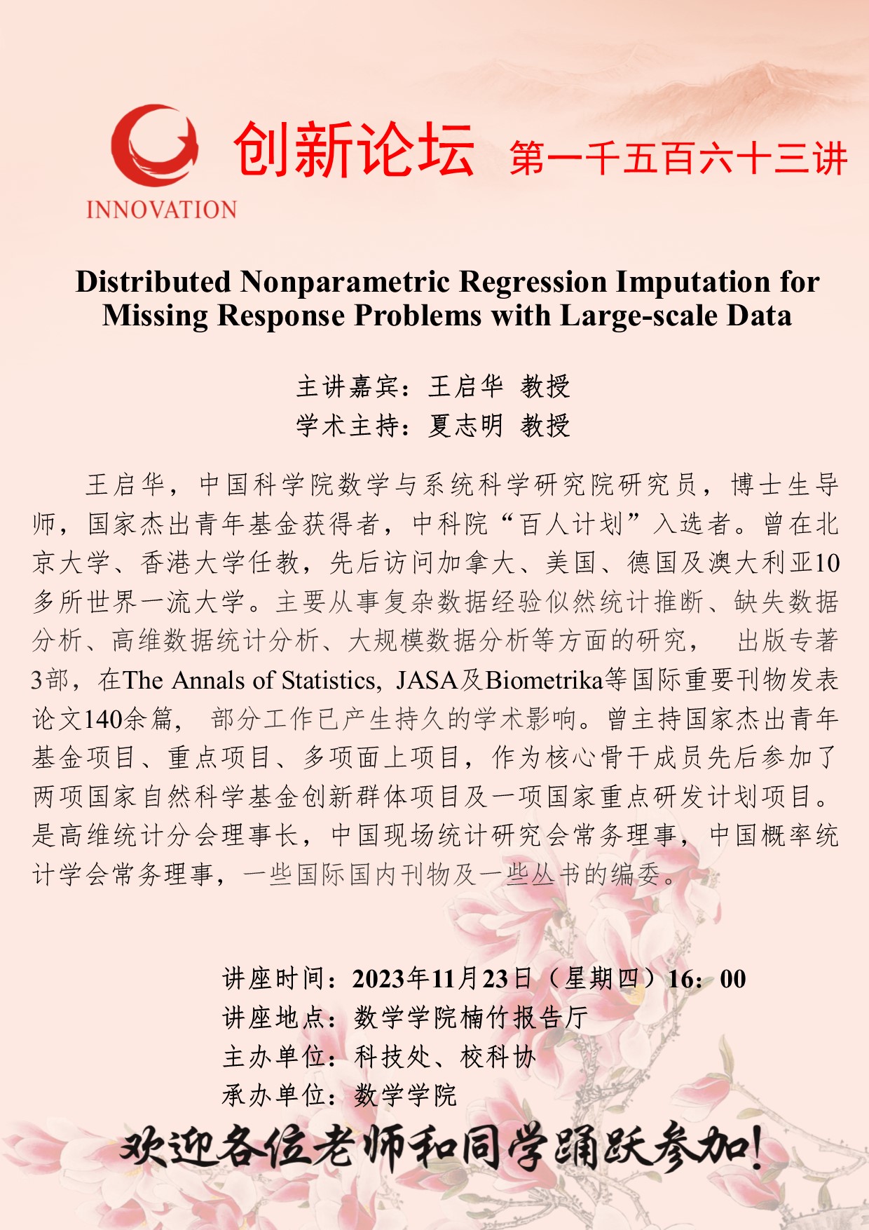 王启华 教授 必赢3003no1线路检测中心创新论坛第一千五百六十三讲:Distributed Nonparametric Regression Imputation for Missing Response Problems with Large-scale Data 讲座时间 2023年11月23日(周四)16:00 讲座地点 数学学院楠竹报告厅 讲座人介绍 王启华 教授 讲座内容
