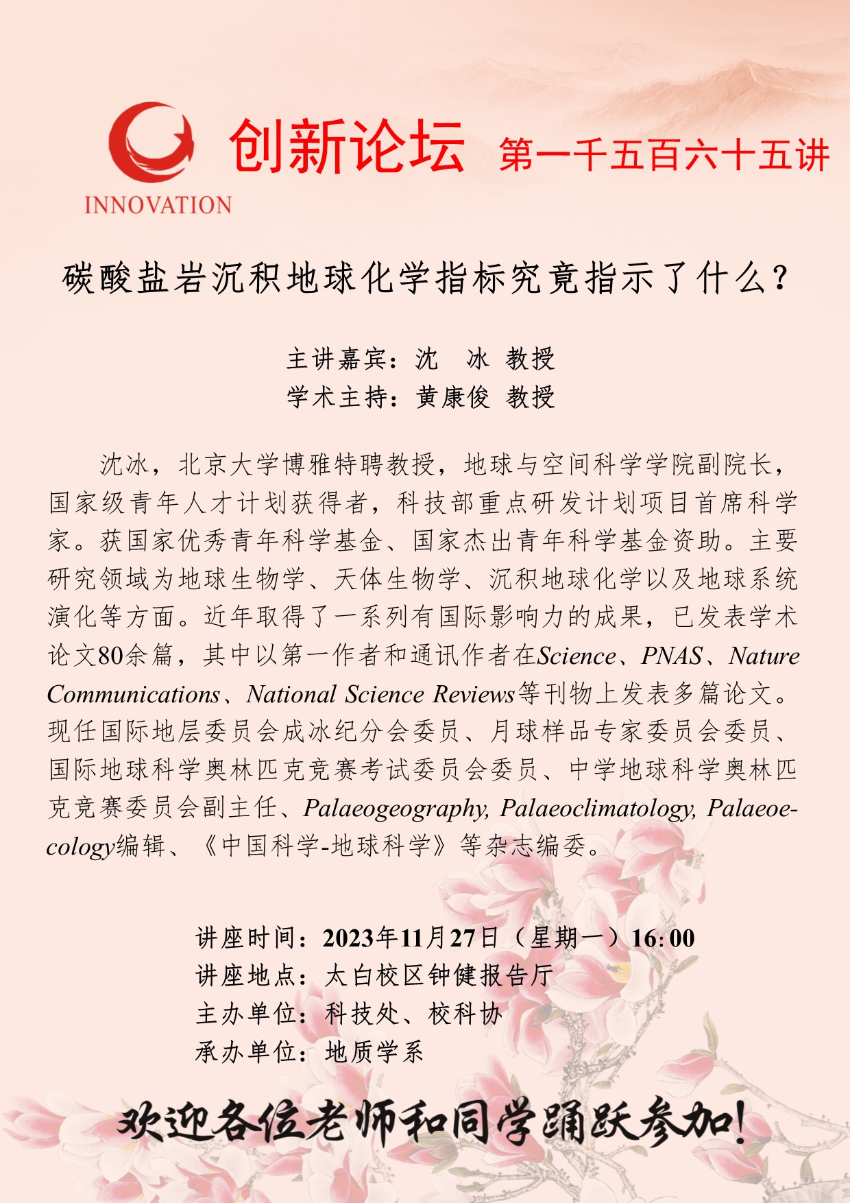沈冰 教授 必赢3003no1线路检测中心创新论坛第一千五百六十五讲:碳酸盐岩沉积地球化学指标究竟指示了什么? 讲座时间 2023年11月27日(星期一)16:00 讲座地点 太白校区钟健报告厅 讲座人介绍 沈冰 教授 讲座内容